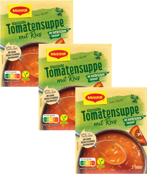 Maggi Enjoy Yourself Tomato Soup with Rice is a true classic among vegetarian soups. A delicious and fruity soup with wholegrain rice. The perfect choice when you want to quickly prepare a tasty tomato soup with rice.