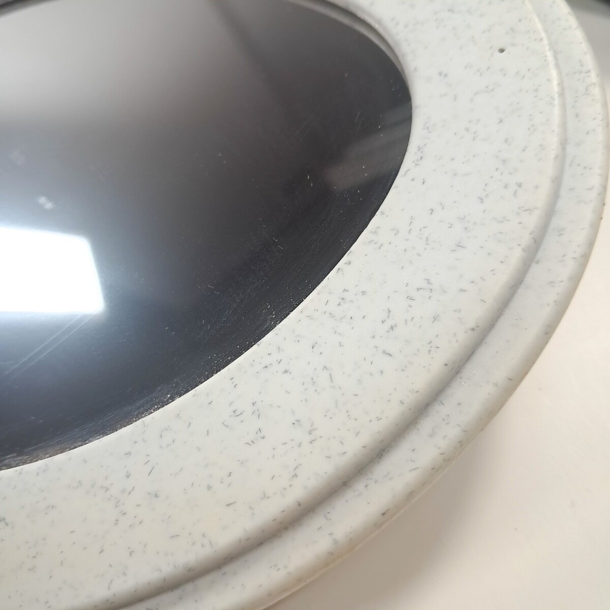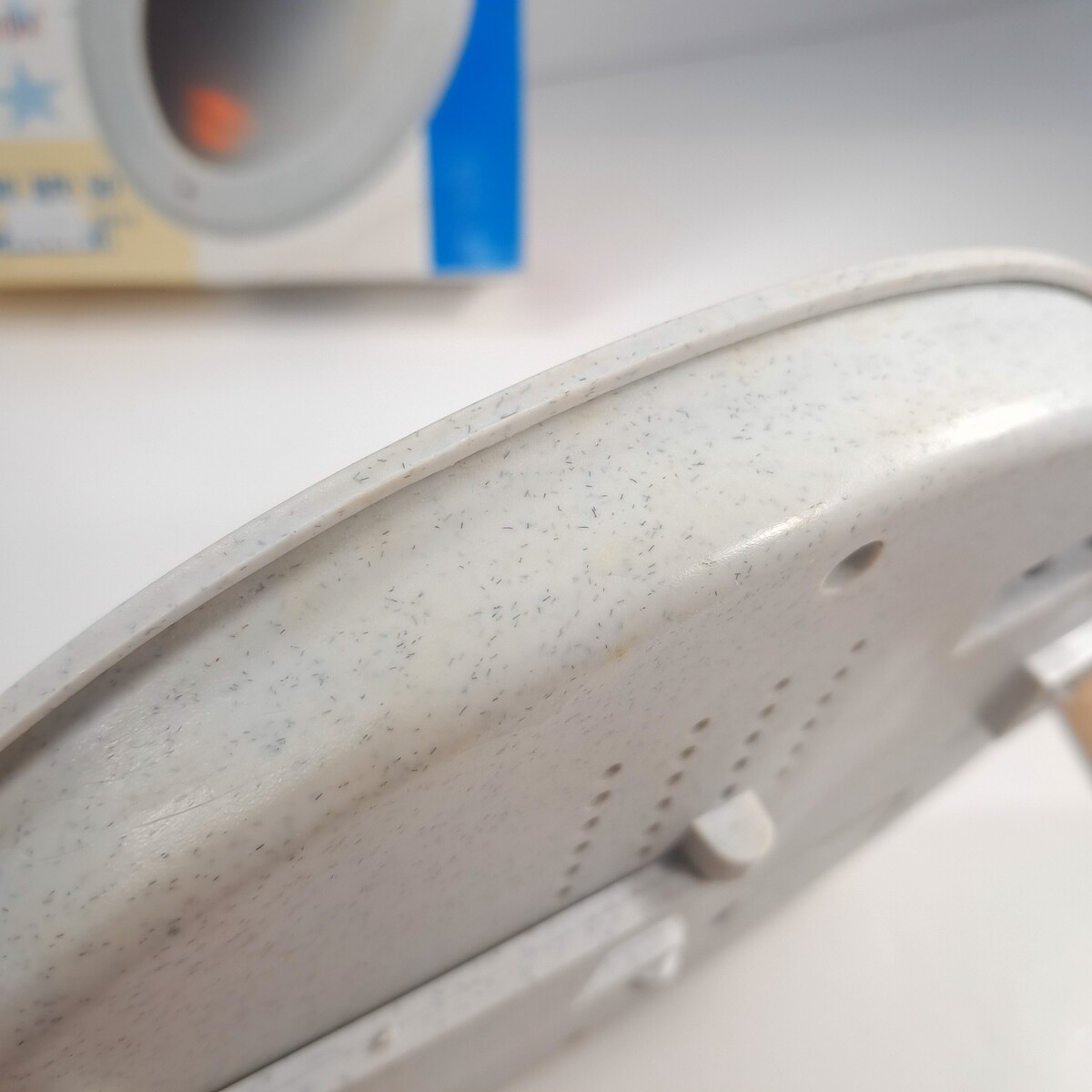 Grey plastic mirror that says YOU ARE SO BEAUTIFUL when motion is detected, and lips appear on the mirror. Plastic has some discoloration, mostly to the back and the easel on the back is broken. Batteries not included. See pics.