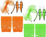 Retro 1980s Accessories for Women: the package offers two engaging sets of clothing accessories in vibrant colors of orange and green; Each set includes 2 lace headbands, 2 pairs of neon earrings, and 2 pairs of fingerless fishnet gloves