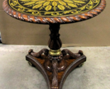 The Maitland-Smith Reverse Painted Glass Table with Lotus Blossom Brass Feet from the 1980s is a stunning accent table perfect for any living room. The round tabletop made of glass with a medium wood tone and intricate lotus blossom brass feet adds a touch of elegance to the room. This original piece does not require any tools for assembly and is a true representation of 1980s style. Made in the Philippines, this accent table is a unique and eye-catching addition to any home decor.