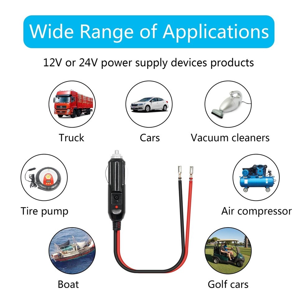 Wide Application12V cigarette lighter to leads terminal cable, for a variety of devices requiring 12V or 24V power supply with terminal, as car blankets, cushions, air compressors, vacuum cleaners and air purifiers.