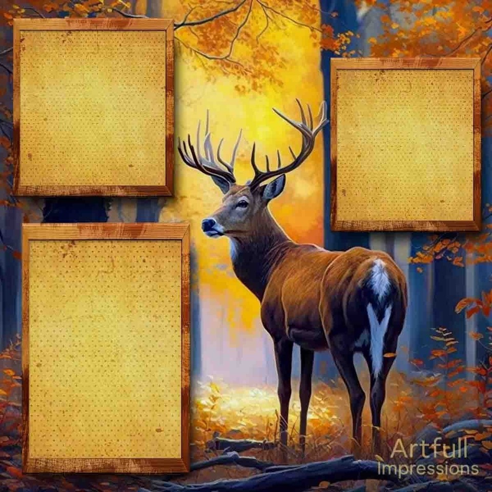 scrapbook page. A powerful buck stands poised in a glowing golden woodland,