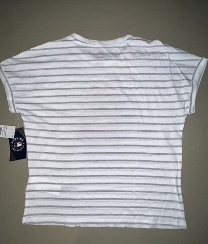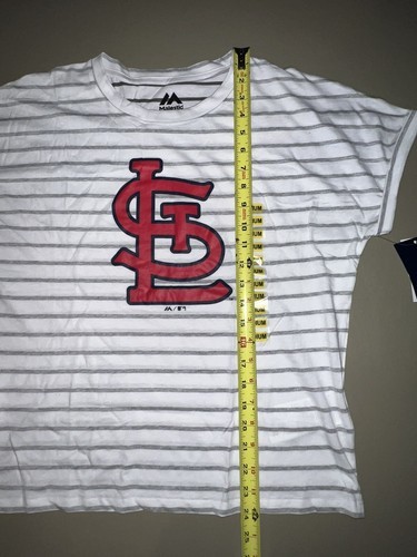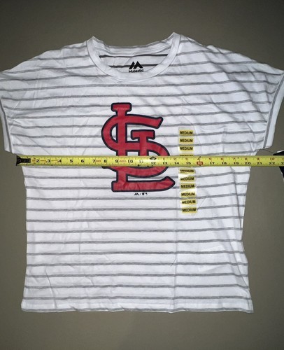 Show your support for the St. Louis Cardinals with this Majestic short sleeve women's T-shirt. The shirt features the team's iconic logo on the front and is made of high-quality materials for long-lasting wear. It is available in size M and features a stylish white and gray stripe design.