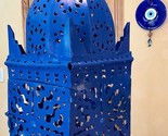 This Moroccan Lantern is offered as a tribute to the exotic Majorelle garden in Marrakesh known by its unique blue color. The most typical of all Moroccan lanterns. It can be used to add an exotic accent around your home or garden. The metal Lantern has a hinged door for easy access and features cutout designs that the light shines through to create a peacefully artistic soft surrounding.