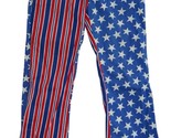 This is a pair of vintage Male Slacks Jeans with an American flag design of stars and stripes. The pants feature a mid-rise fit with a flared style, classic denim fabric, and a multicolor striped pattern. They measure approx. 14.5" across the waist with 29.5" inseam. These do have some flaws due to age - yellowing, small spots and torn fabric around the fastener. Perfect for summer, fall, and spring, these slacks offer a comfortable and stylish option for women looking to make a statement.