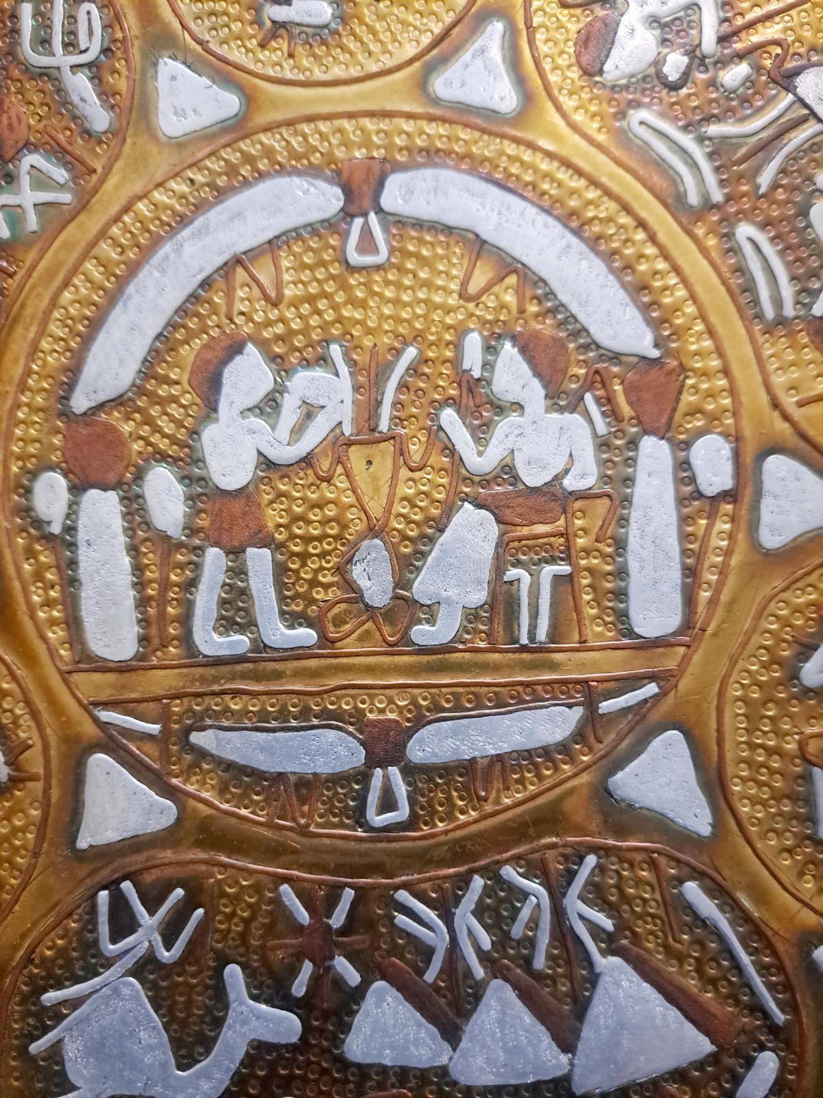This vintage Handmade silver on copper tray, designed with what appears to be hieroglyphic designs