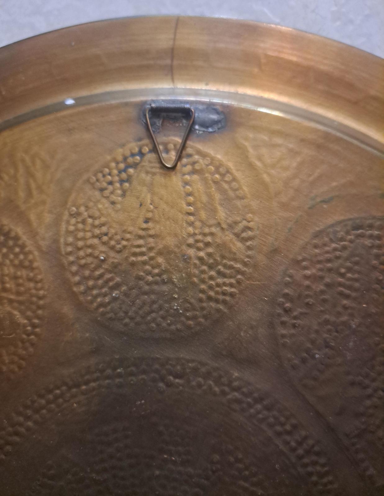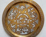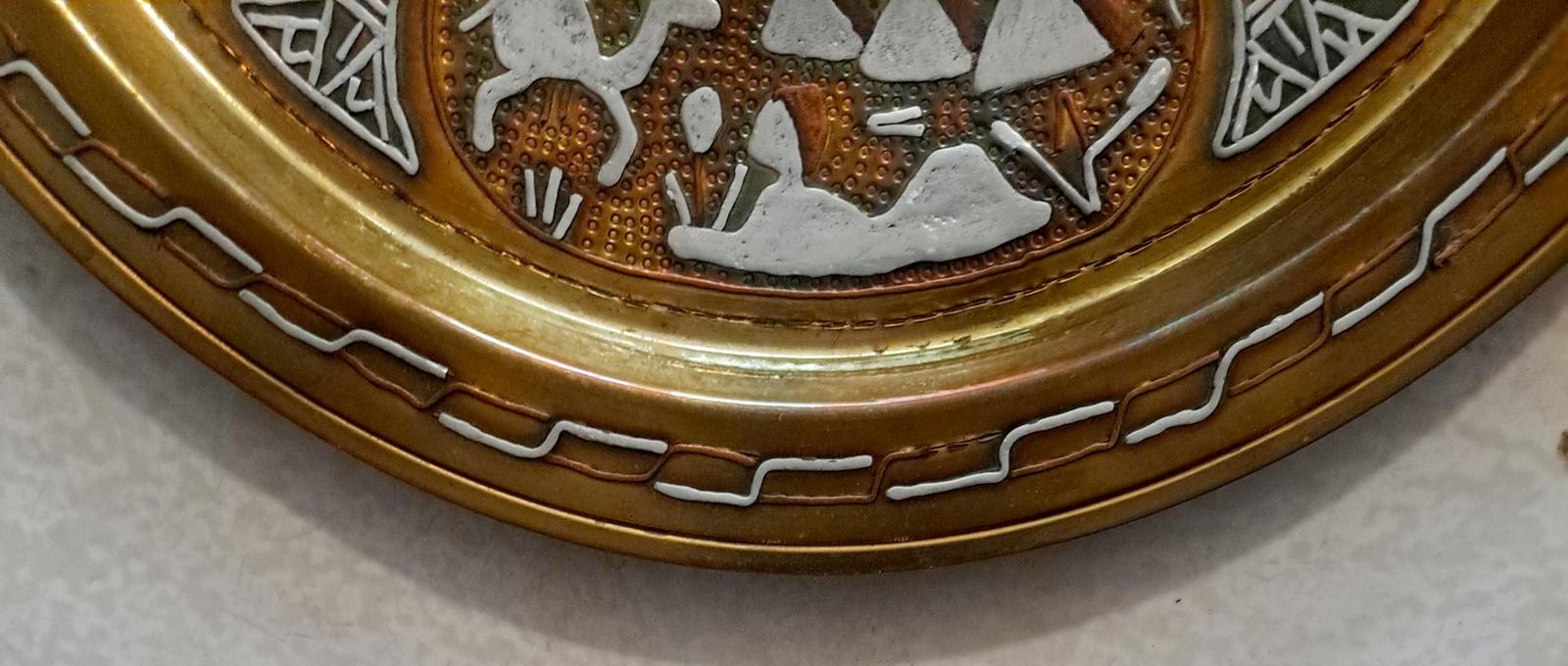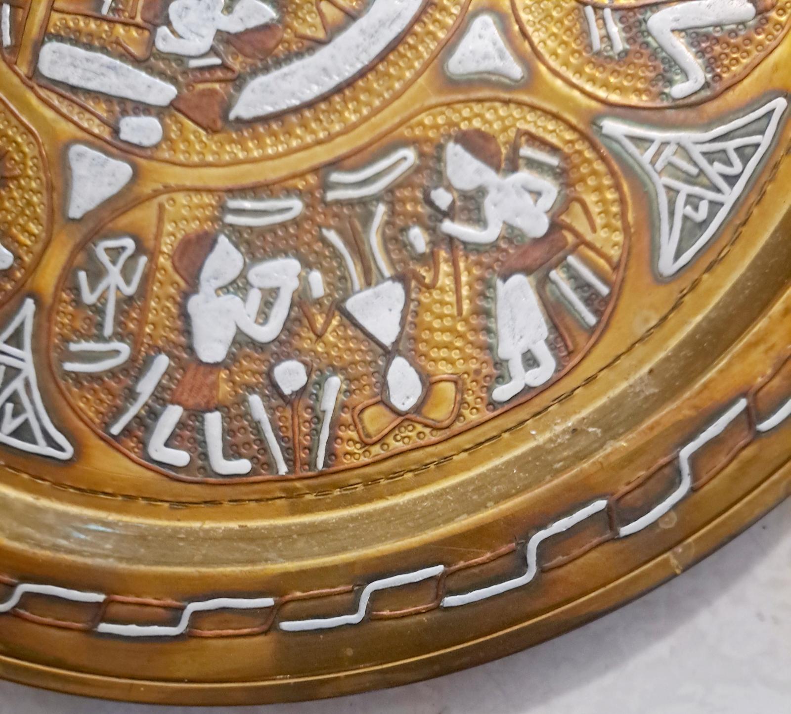 Brass tray, potentially inlaid with silver and copper, featuring decorative elements like camels and other figures. This is decorative wall art or a serving platter.