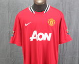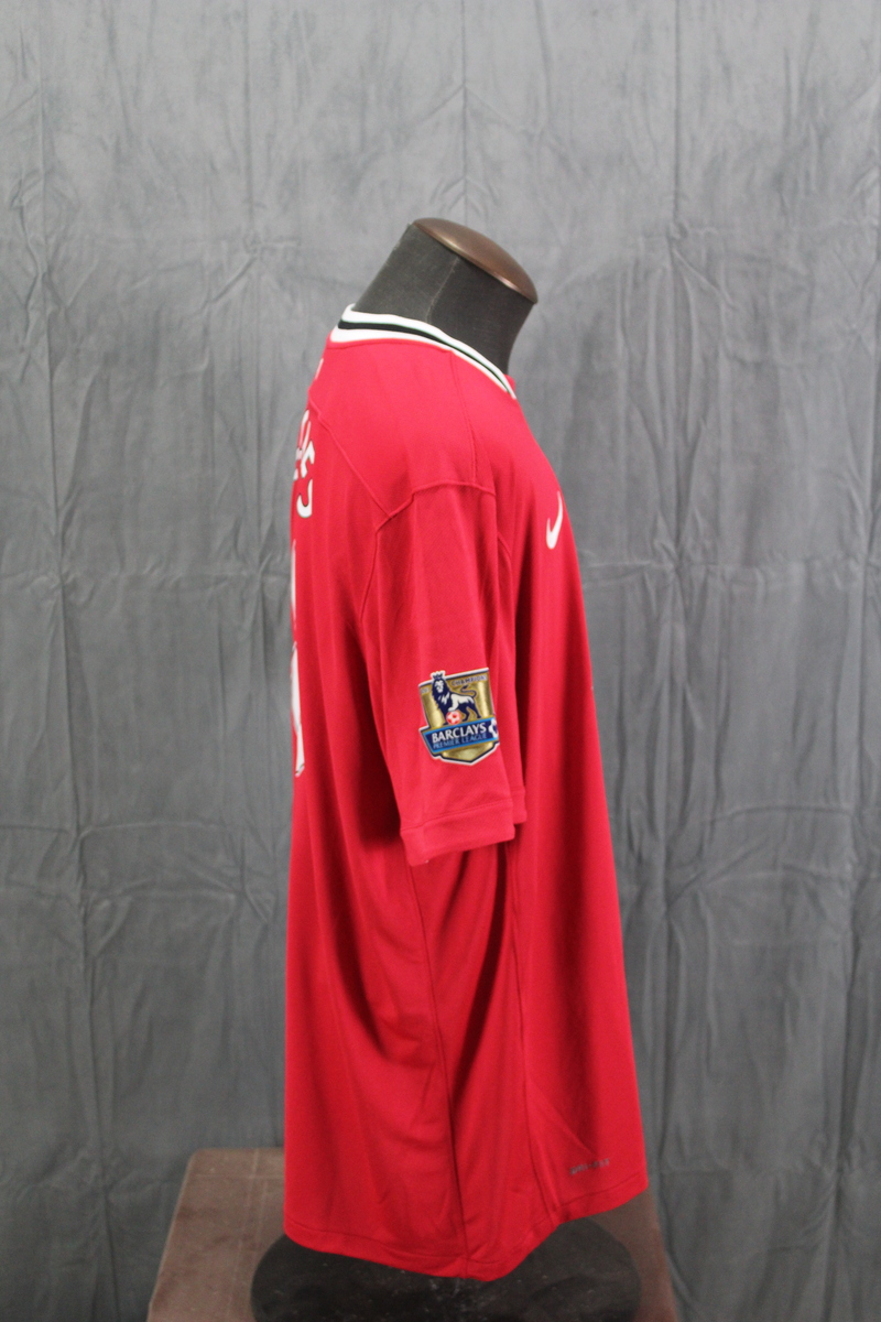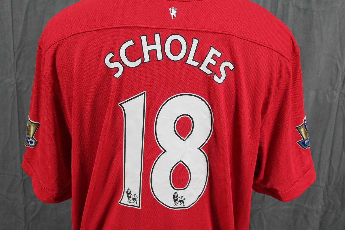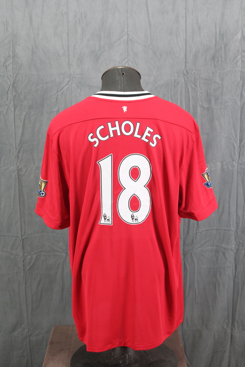 Up for sale is a retro Manchester United jersey. It is a 2012 home jersey with a red base colour and black and white trim. The front of the jersey has the Nike and Manchester United logos stitched in. The chest has team sponsor AIG's logo crested on. Each sleeve has the Barclays EPL logo crested on. The back of the jersey has Scholes and the number 18 crested on. What a great jersey do not miss out on it.