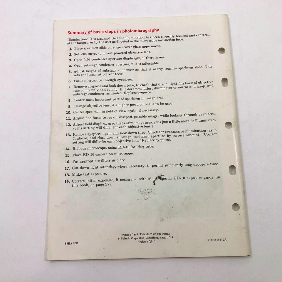 Instruction manual for the Polaroid Instrument Camera Model ED-10 for photomicrography