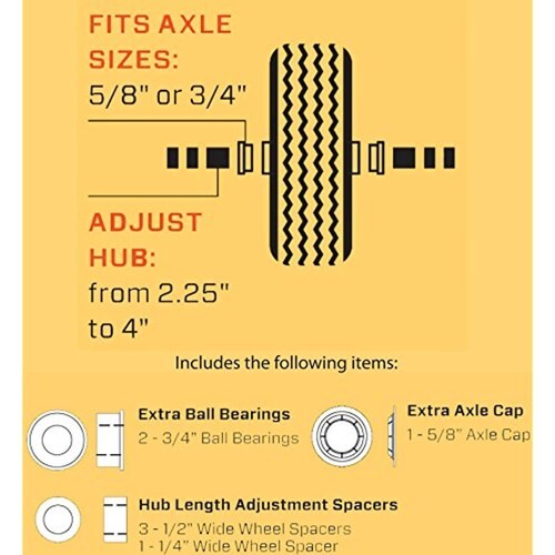 Adapter kit features: (1) 1/4" spacers, (3) 1/2" spacers, (2) 3/4" ball bearings, (1) 5/8" axle cap