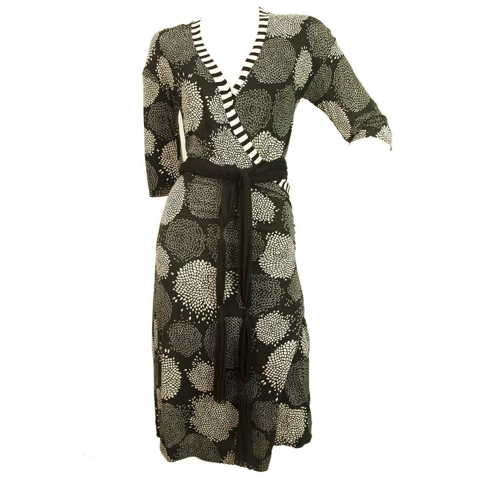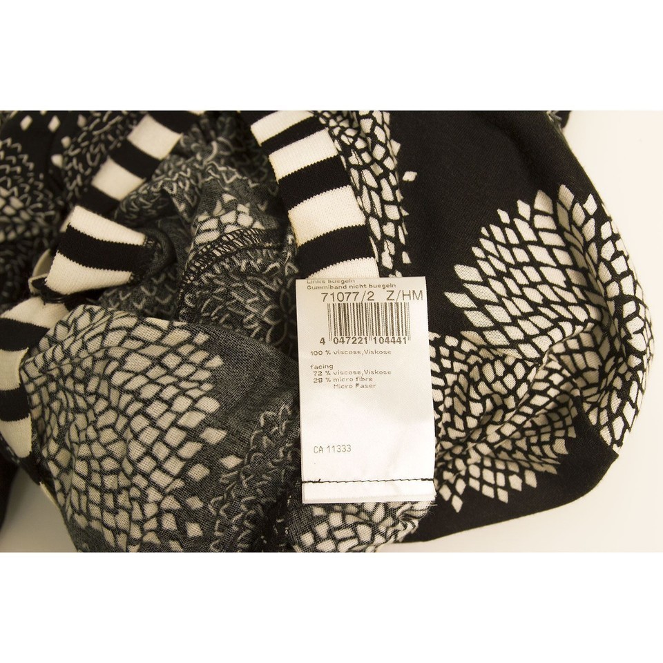 Black , white and 50 shades of gray floral print dress by Marc Cain that features faux wrap style with V neck and 3/4 sleeves. It is unlined , simply slips on and comes with a black fabric belt embellished with tassels. The soft viscose fabric perfectly embraces your body.