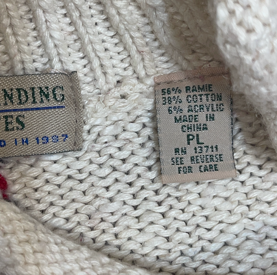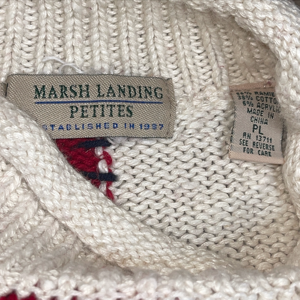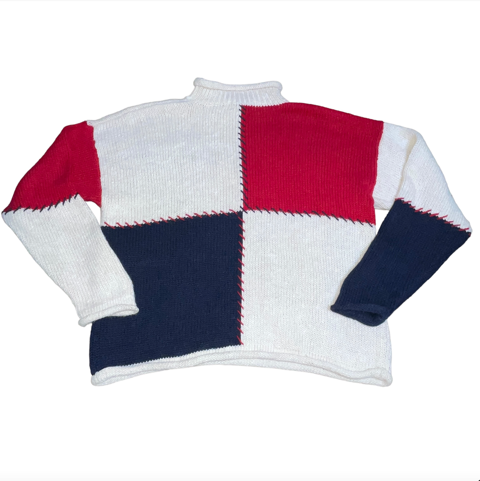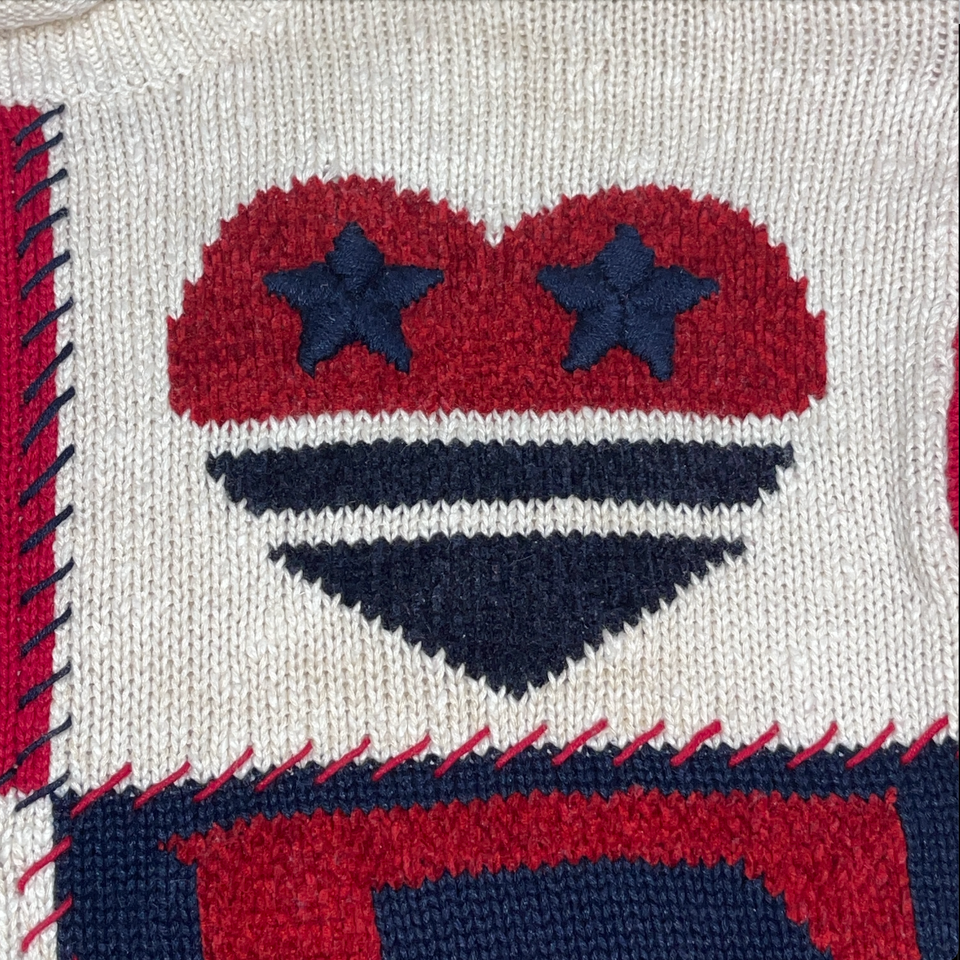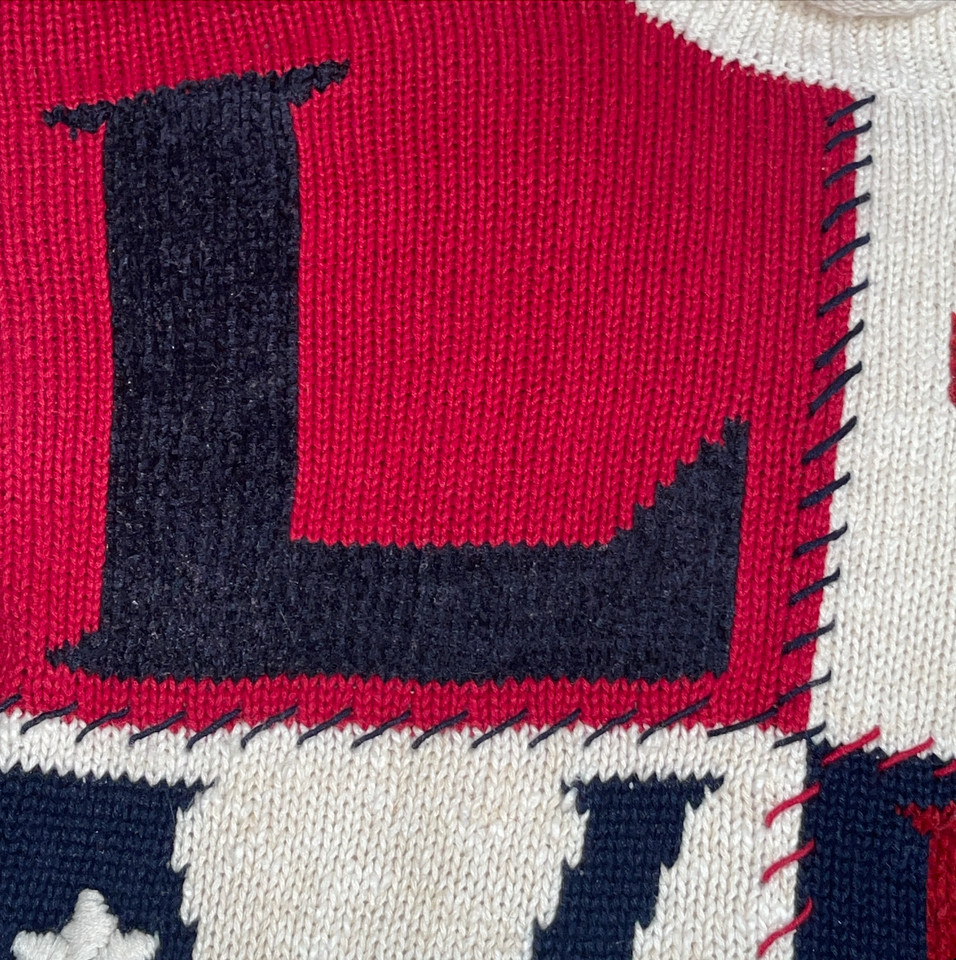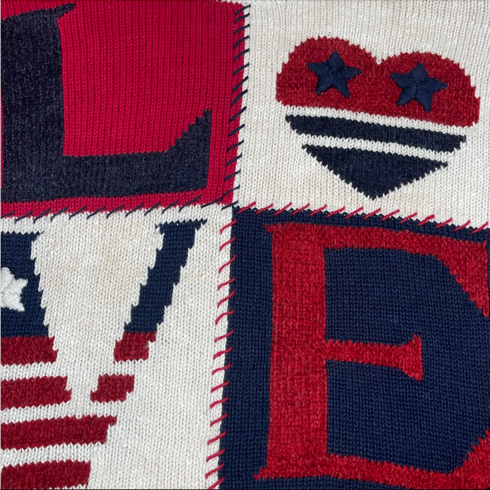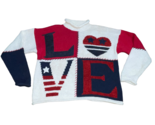 Great condition. Size tag PL petite large. Measures 23 inches across the chest, 22 inches overall length, 19 inch long sleeves. Rolled hems. Perfect patriotic sweater! Red, white, blue with "LOVE" spell out. Color block. Kind of a boxy fit. Very classy look. Please see all gallery photos. We are a smoke free, pet friendly home. Have a great day!