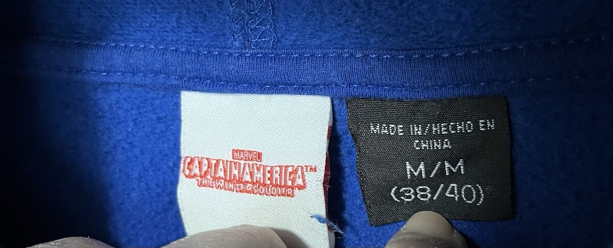 This Marvel Captain America Hoodie in size medium is a stylish addition to any man's wardrobe. The navy blue color with red laces adds a unique touch to the classic hoodie design. The long sleeves, hooded closure, and regular fit make it comfortable for all seasons. With its solid pattern and comic theme, this hoodie is perfect for fans of the iconic Captain America character. Machine washable for easy care, this hoodie is a must-have for any Marvel enthusiast.