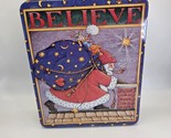 Charming vintage Mary Engelbreit "Believe" Christmas tin, dated 1986 and licensed by Midwest Importers of Cannon Falls. Features a whimsical Santa carrying a starry sack of toys, climbing into a chimney with pipe in hand. The tin is richly decorated with Engelbreit?s signature style, accented with moons, stars, and playful holiday details.