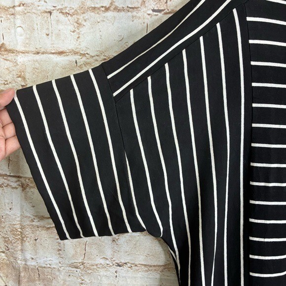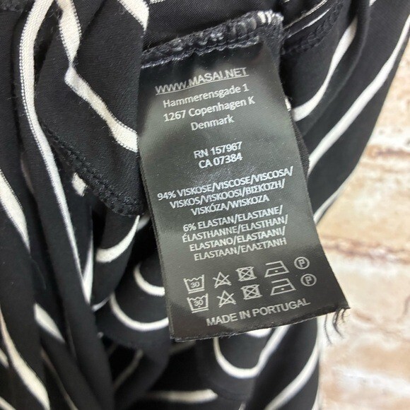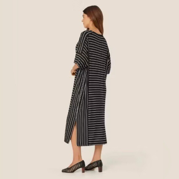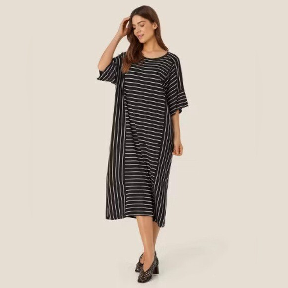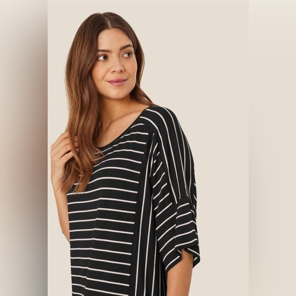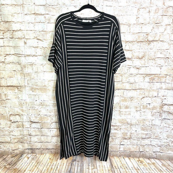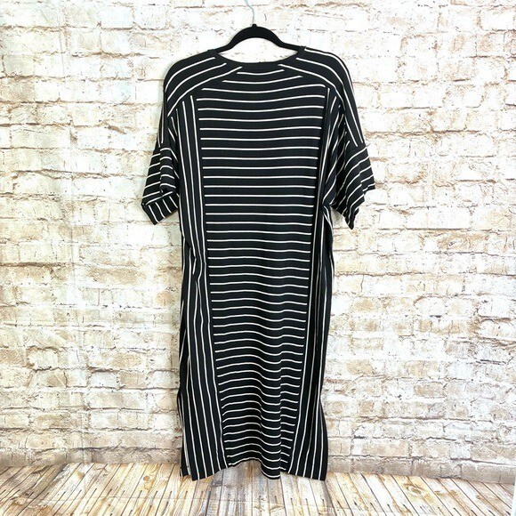 Masai Copenhagen Noele Striped Jersey Laglenlook Dress Size Medium - 94 viscose 6 Elastane - classic scoop neck and half sleeves, dropped shoulder side slits, oversized. Black white stripe