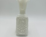 This vintage Imperial glass vase features a unique Masque Drama pattern of a Jester and Flowers with an Evil Face. The vase stands at 8 1/2 inches tall and has a width of 3 1/4 inches. It is made of milk glass and has an impressed backstamp.