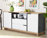 Create a playful retro feel in your dining space with the Astrid sideboard. Constructed from wood, the Astrid features a complementary color palette of white, oak, and Grayfor a cool, modern look. Two doors open to reveal four shelves with ample space to store plates and glassware. Additional storage space is provided by one open shelf and two drawers. Inspired by mid-century modern design, the Astrid features clean lines and a low profile. Cut-out handles add a unique touch. The Astrid sideboard is made in Malaysia and requires assembly.
