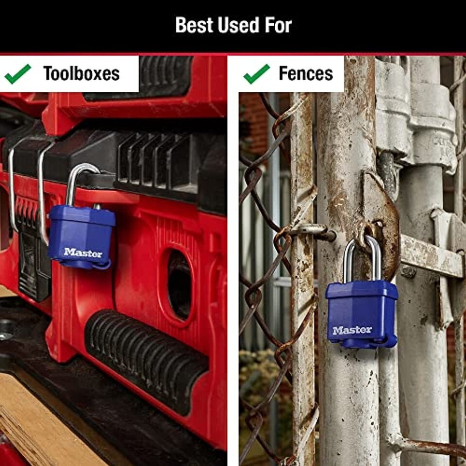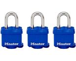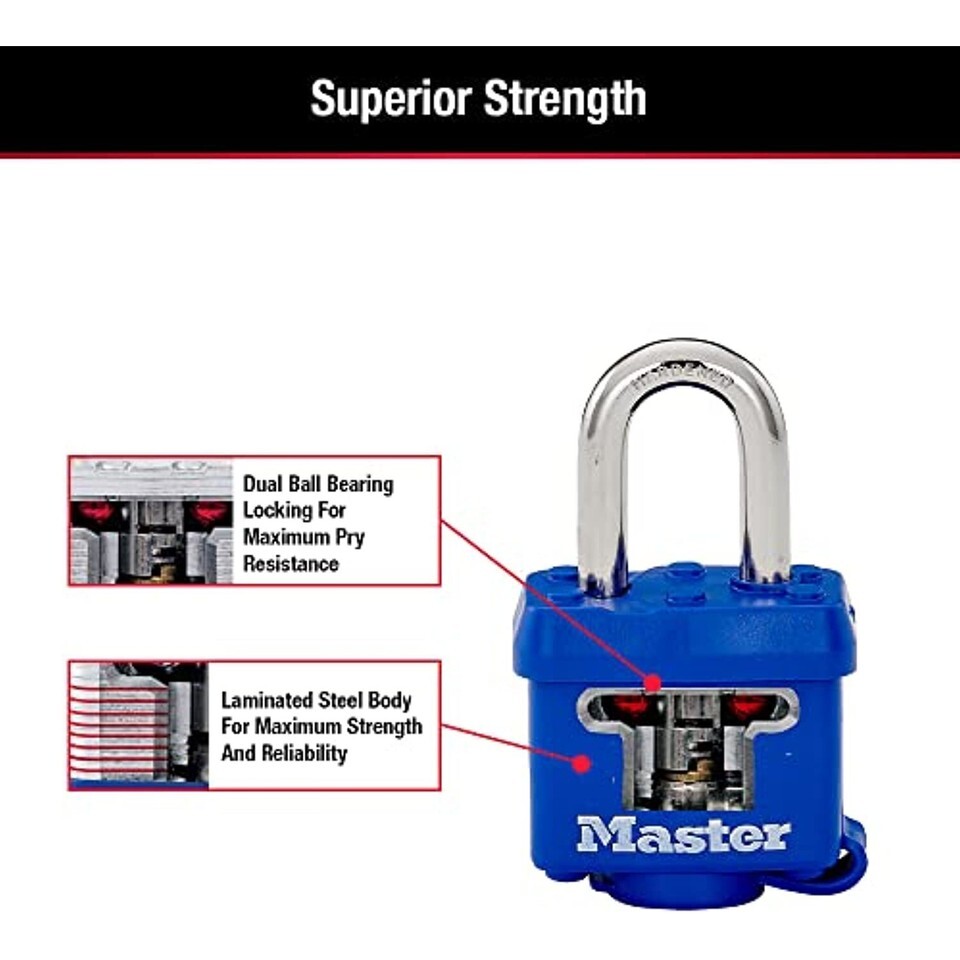 Product Description The Master Lock 312TRI Laminated Padlock with Key features a 1-9/16in (40mm) wide laminated steel body for maximum strength and reliability. The 9/32in (7mm) diameter shackle is 1-1/16in (27mm) long and made of hardened steel, offering extra resistance to cutting and sawing. A blue weather resistant thermoplastic shell is designed to add protection against moisture, dirt and grime. The 4-pin cylinder prevents picking and the dual locking ball bearings provide resistance against prying and hammering. The Limited Lifetime Warranty provides peace of mind from a brand you can trust. From the Manufacturer Master Lock 312TRI3-Pack of 1-9/16" Laminated Padlocks with Blue Thermoplastic Shell for outdoor protection