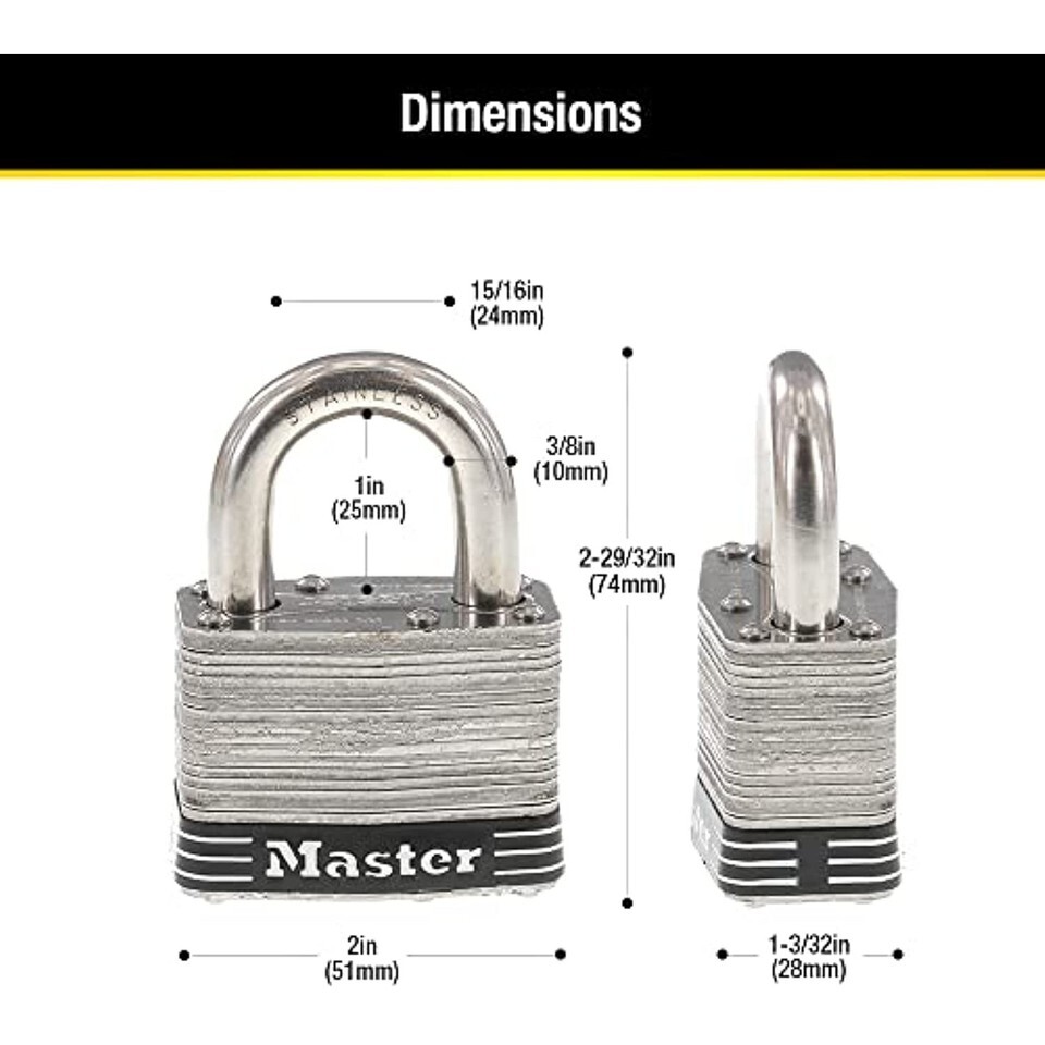 The Master Lock 5SSKAD Stainless Steel Padlock with Key features a 2 in. (51 mm) wide laminated stainless steel body for maximum strength, reliability, and weather resistance. The 3/8 in. (10 mm) diameter shackle is 1 in. (25 mm) long and made of stainless steel, offering maximum resistance to cutting, sawing and weather. The 4-pin cylinder prevents picking and the dual locking ball bearings provide resistance against prying and hammering. The Lifetime Guarantee provides peace of mind from a brand you know and can trust.