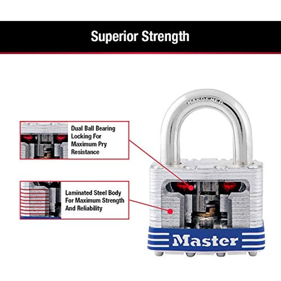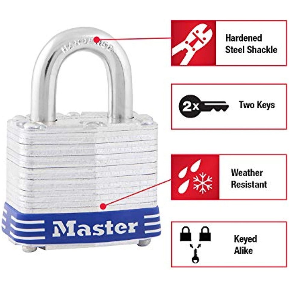 Product Description The Master Lock 5T Laminated Steel Padlocks with Key feature a 2 in. (51 mm) wide laminated steel body for maximum strength and reliability. The 3/8 in. (10 mm) diameter shackle is 1 in. (25 mm) long and made of hardened boron alloy, offering maximum resistance to cutting and sawing. The 4-pin cylinder prevents picking and the dual locking ball bearings provide resistance against prying and hammering. The Lifetime Guarantee provides peace of mind from a brand you know and can trust. From the Manufacturer Master Lock 5T 2-Pack of 2" Wide Laminated Pin Tumbler Padlocks - Keyed Alike