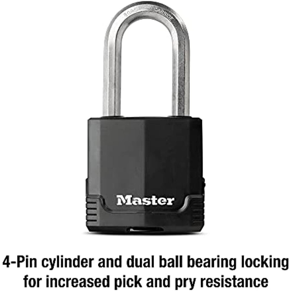 4-Pin cylinder and dual ball bearing locking for increased pick and pry resistance; Covered keyway and shackle for added weather protection
