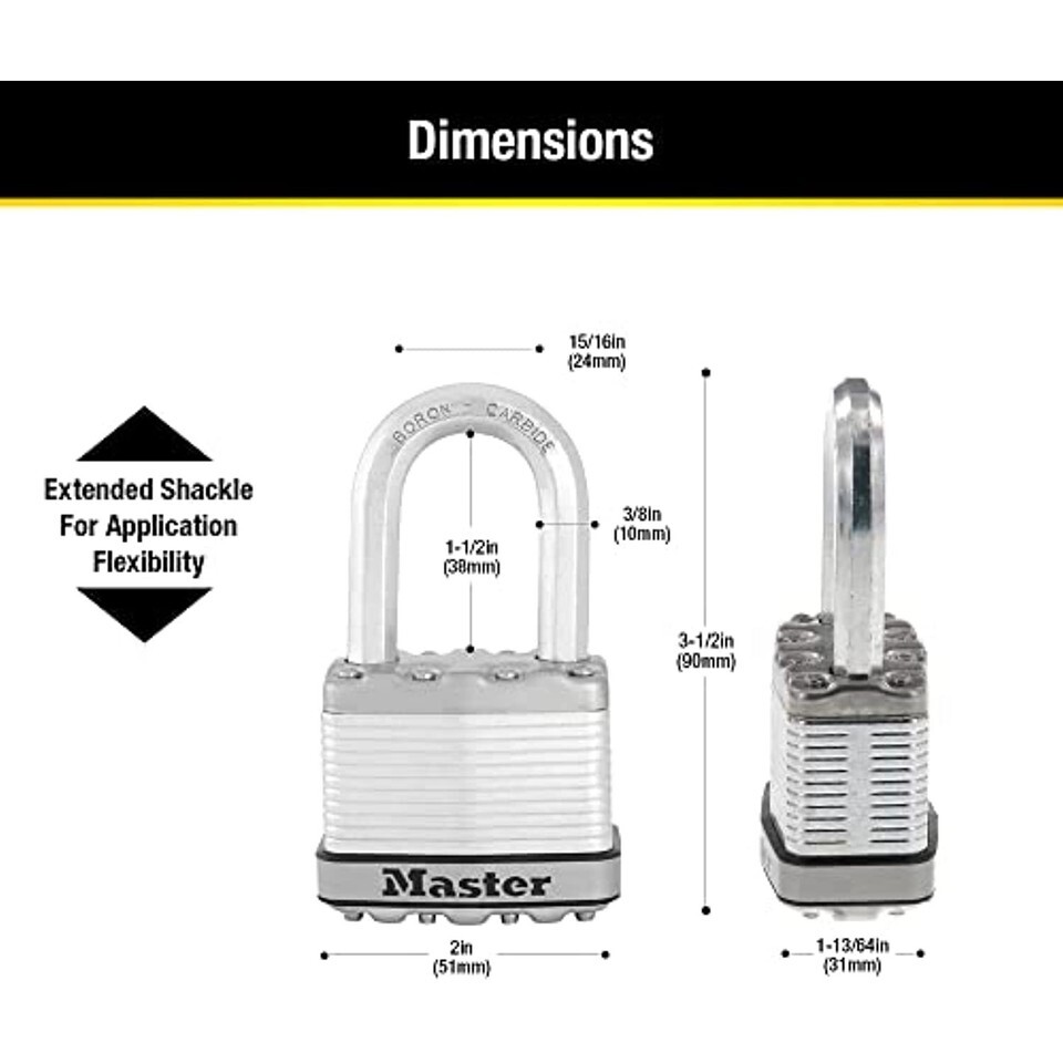 2 in. (51 mm) wide lock body; 3/8 in. (10 mm) diameter shackle with 1-1/2 in. (38 mm) length, 15/16 in. (24 mm) width; Extended shackle for application flexibility