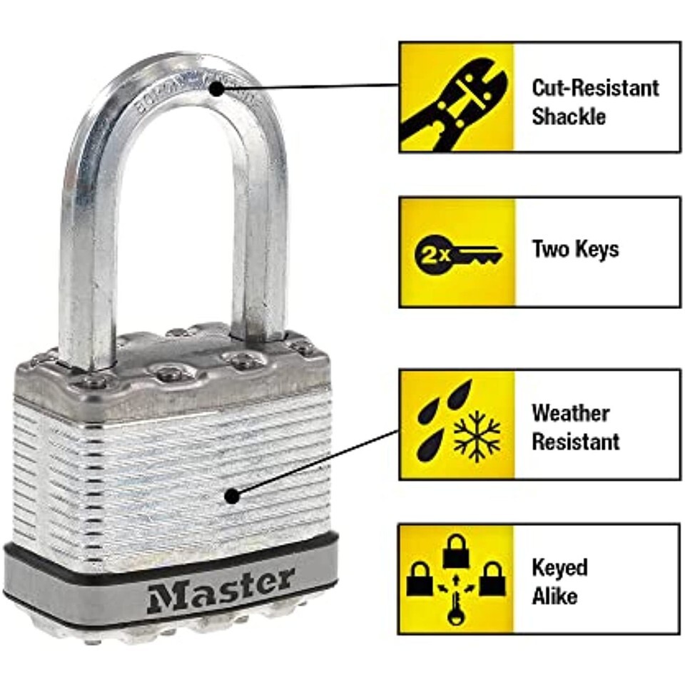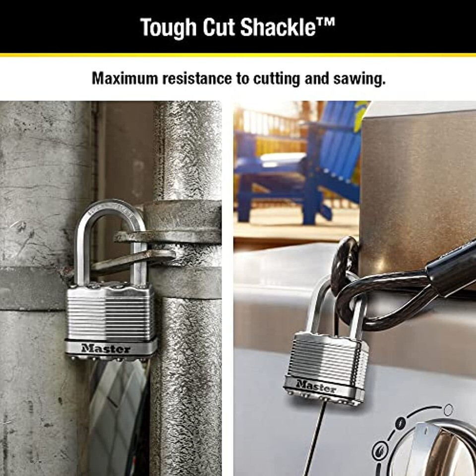 The Master Lock Magnum M5XTRILF Heavy Duty Laminated Padlock with Key features a 2 in. (51mm) wide laminated steel body for maximum strength and reliability, and is surrounded by stainless steel and zinc outer components for weather resistance. The 3/8 in. (10mm) diameter octagonal shackle is 1-1/2 in. (38mm) long and made of Tough-Cut boron-carbide, 50% harder than hardened steel, offering maximum resistance to cutting and sawing. The 4-pin cylinder prevents picking and the dual locking ball bearings provide maximum resistance against prying and hammering. The Lifetime Guarantee provides peace of mind from a brand you know and can trust.
