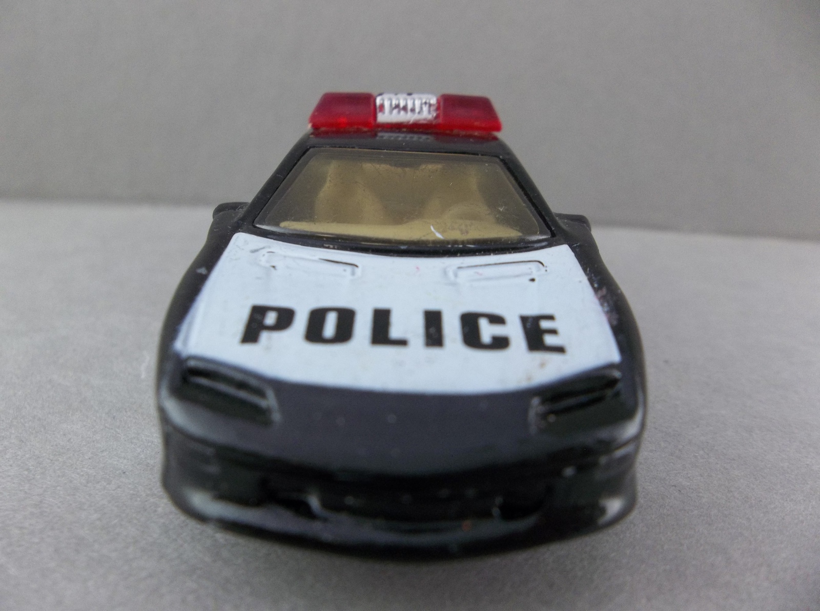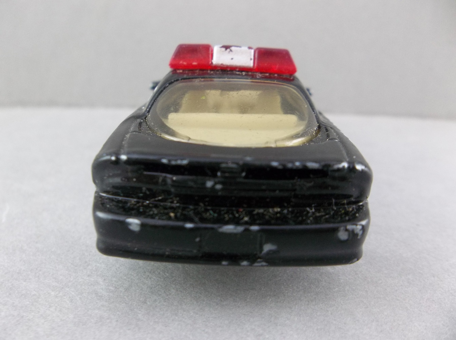 Condition: The car is in good used condition. The paint has a few chips from age and play. The decals show wear but still look good. The emergency lights are intact with no damage, though there is some surface wear. The chrome on the wheels looks good. The car rolls very well.