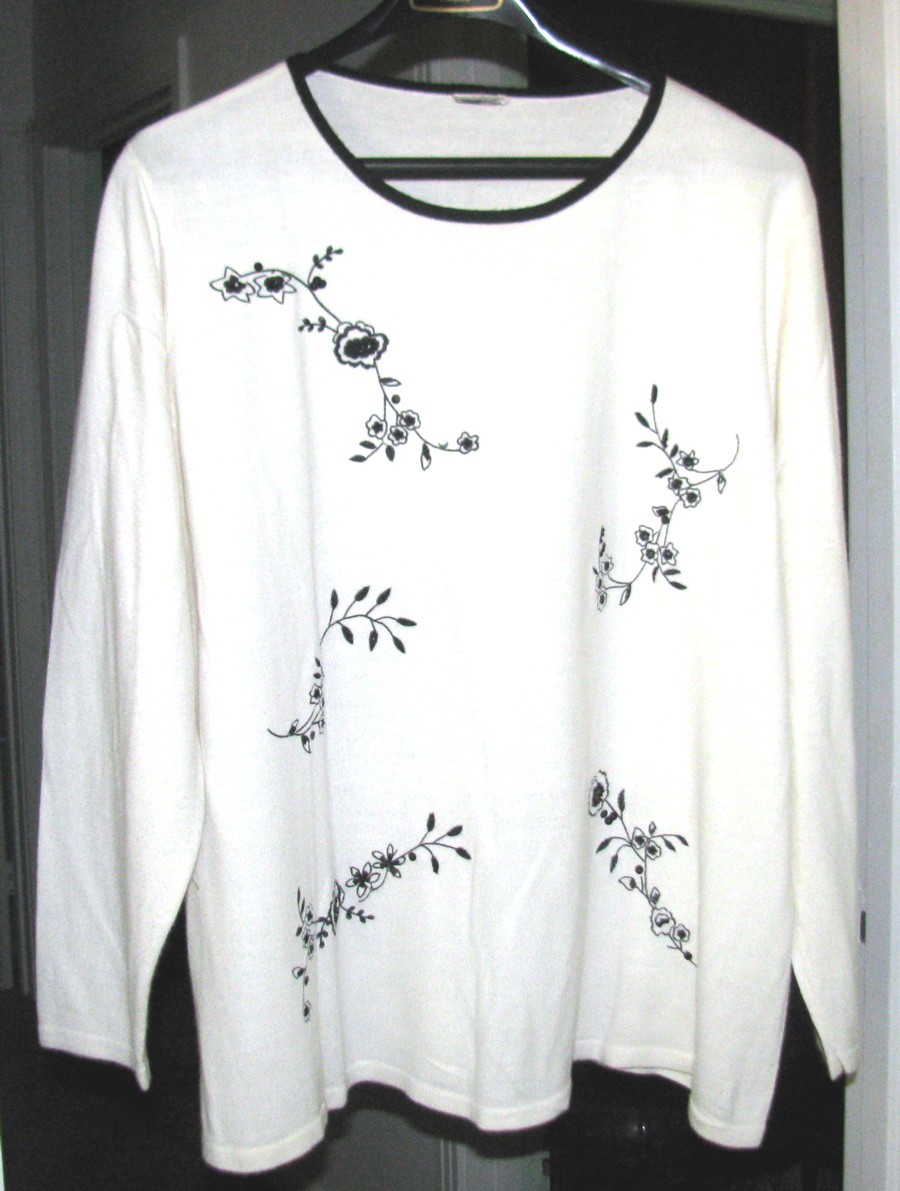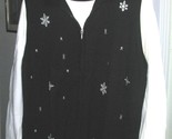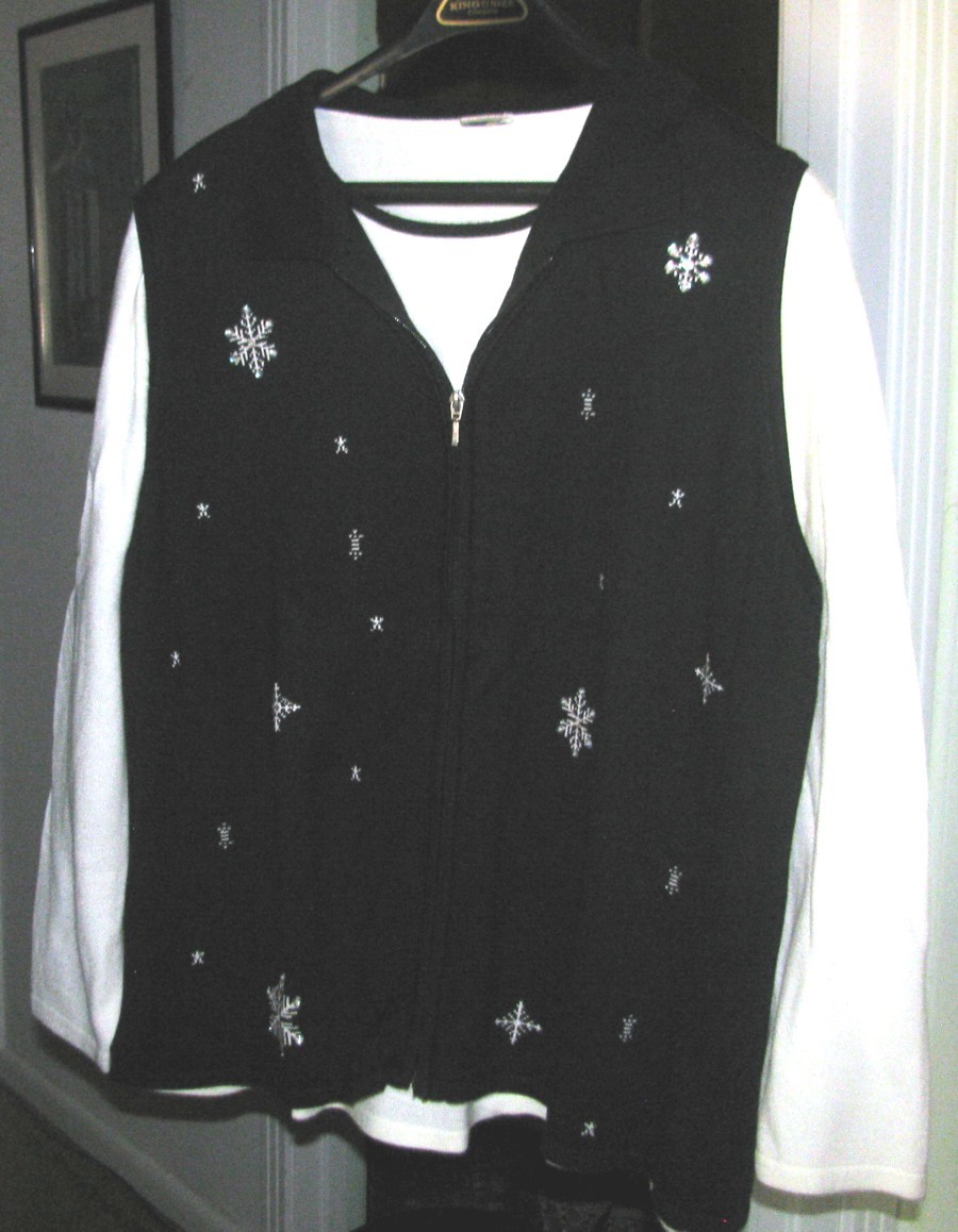 Excellent Condition on this Ladies Plus Size 3X long-sleeved Cream sweater matching Black Vest . The sweater is a pullover with rounded neckline and lovely embroidered and beaded floral designs on front. The matching Vest is a solid black with white embroidered snowflakes with sequin beaded additionas on the larger ones. The back of the vest is solid black. it also has a zip front with a lay down collar. No side slits.