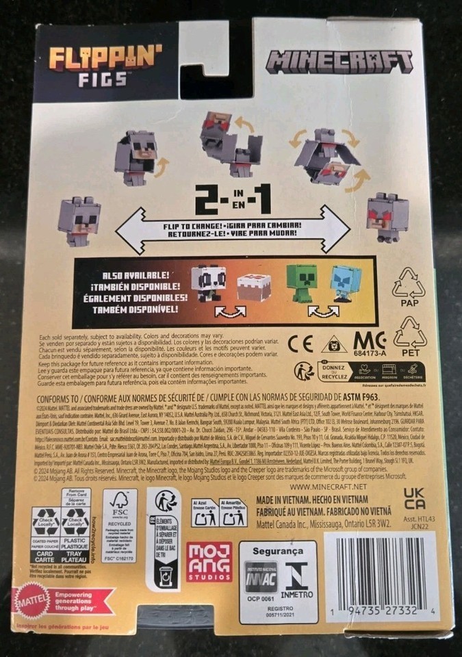 The product is a set of Mattel Minecraft Flippin' Figs featuring a Tamed Wolf and a Hostile Wolf, measuring approximately 4 inches in size. These action figures are part of the Minecraft franchise, allowing children to bring the virtual characters to life in a tangible form. With its unique flipping design, this toy offers interactive and imaginative play opportunities for fans of the popular game.