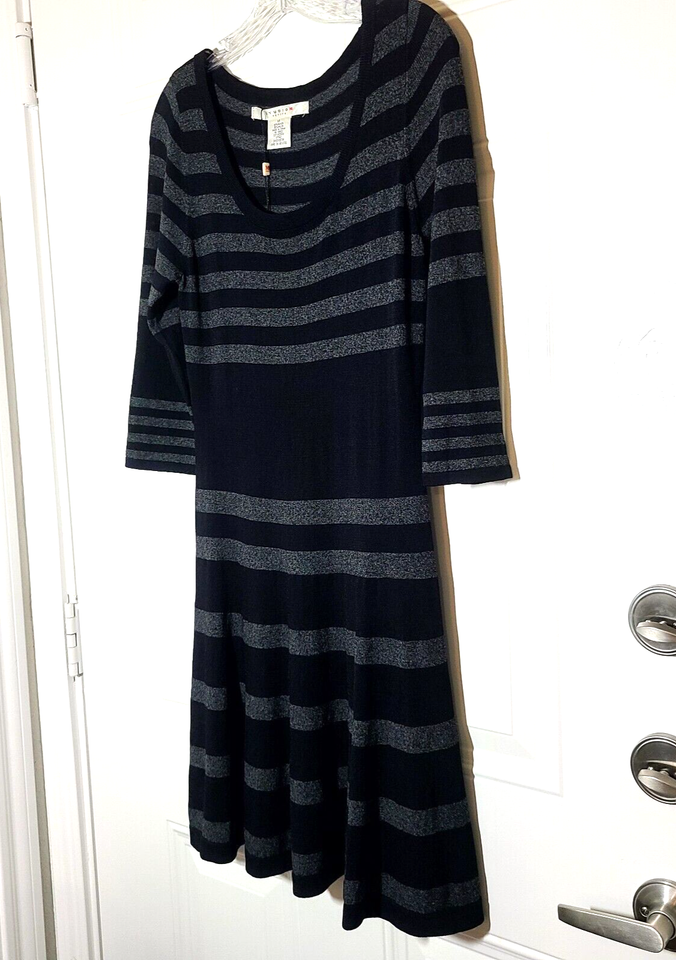 - Max Studio Dress Size MP Fit Flare Stripe Black Gray 3/4 Sleeve Stretch