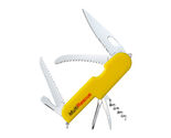Maxam Multi-Function Rescue Knife: Measures 5 when closed. The blades are stainless steel and the Yellow handle is durable Leymar. Functions include: bottle opener, sturdy reamer, phillips screwdriver, slotted screwdriver, wood/rope saw, cutting blade, glass breaker, corkscrew, seat belt cutter.