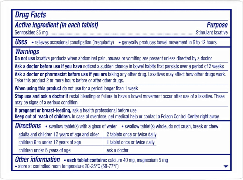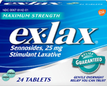 ex-lax Maximum Strength Stimulant Constipation Relief Pills are gentle laxatives that provide dependable relief of occasional constipation. This sennosides laxative works gently to effectively produce a bowel movement in as little as 6 to 12 hours. ex-lax gentle laxatives for constipation come in convenient tablet form, making them easy to dose with no mixing and no mess. Each maximum strength laxative tablet contains 25mg sennosides, 40mg calcium and 5mg magnesium. Adults and children 12 years and older may take two tablets once or twice daily, and children ages 6 to 11 years may take one tablet once or twice daily. Use ex-lax stimulant laxative pills for no longer than 7 days and for no other purpose than the relief of occasional constipation, unless directed otherwise by a doctor. Trust ex-lax for guaranteed relief every time.