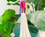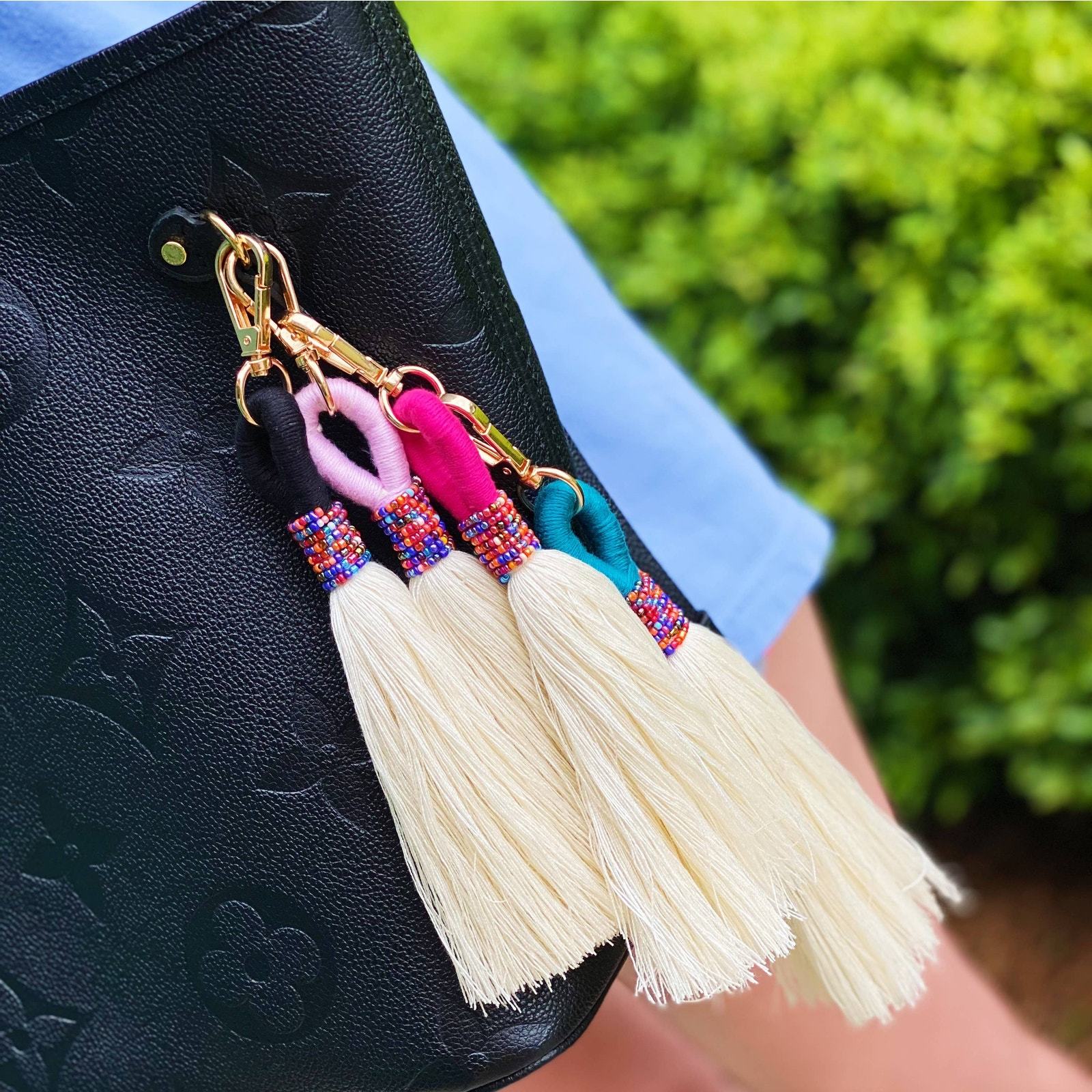 Absolutely beautiful tassel key chain in jewel beaded details and colorful threaded accent! Extended length and fuller tassel to make this key chain a perfect trendy statement piece Great for keys and bag charm Gold hardware