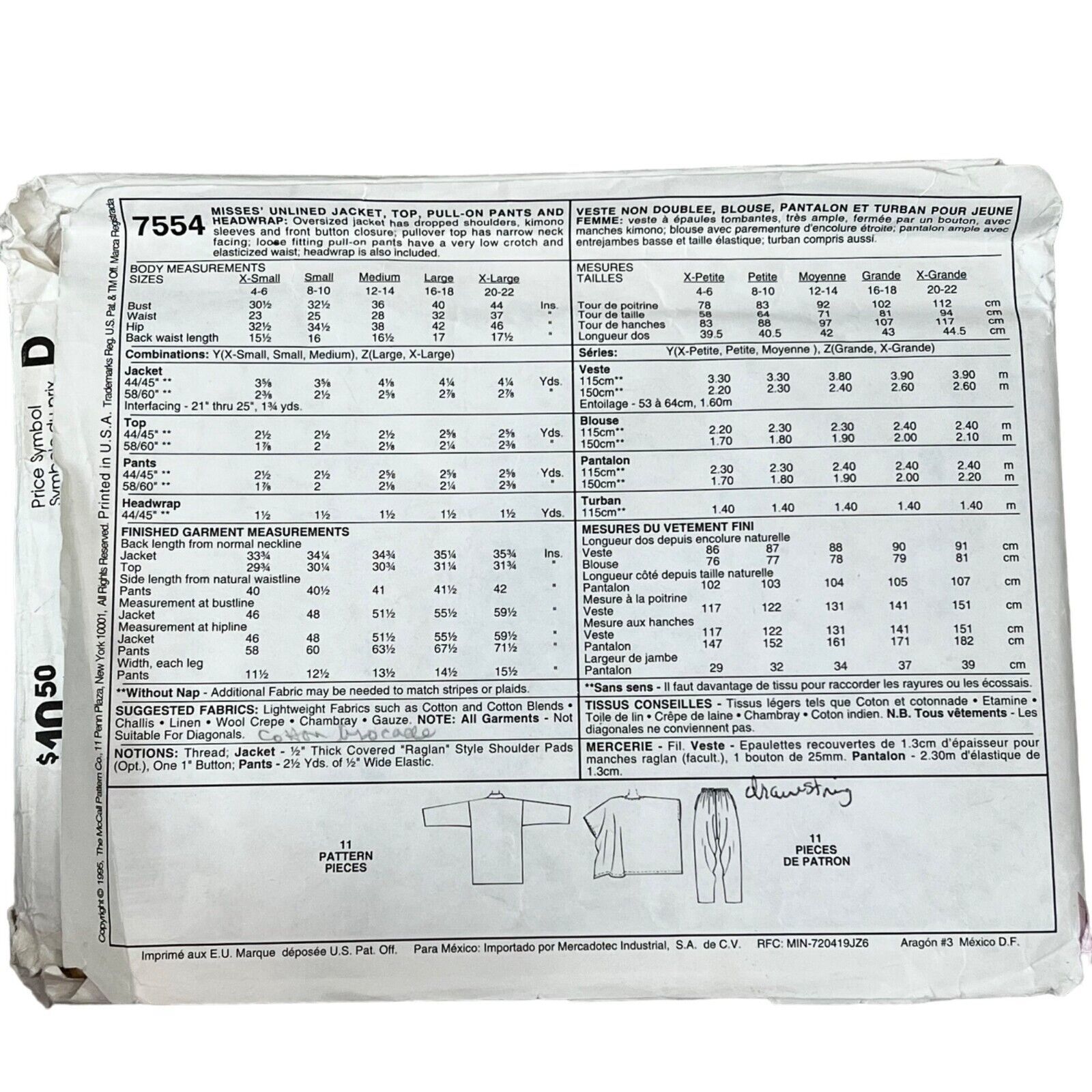 - McCall's Women's Unlined Jacket Top Pants & Turban Sewing Pattern 7554