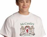 Product description: McCauley Irish Coat of Arms Tee Shirt in White. Every Irish family has a story to tell, probably hundreds of stories. Your Irish coat of arms is a visual record of your family's oldest, most significant stories. Here, they're told in bright, permanent artwork on these fine-quality, 100% cotton Gildan tee shirts. Over 25 years of heraldry research and over 1000 available Irish family coat of arms.
