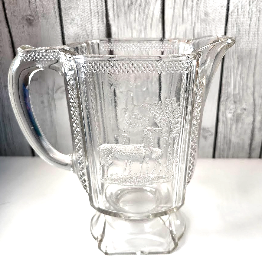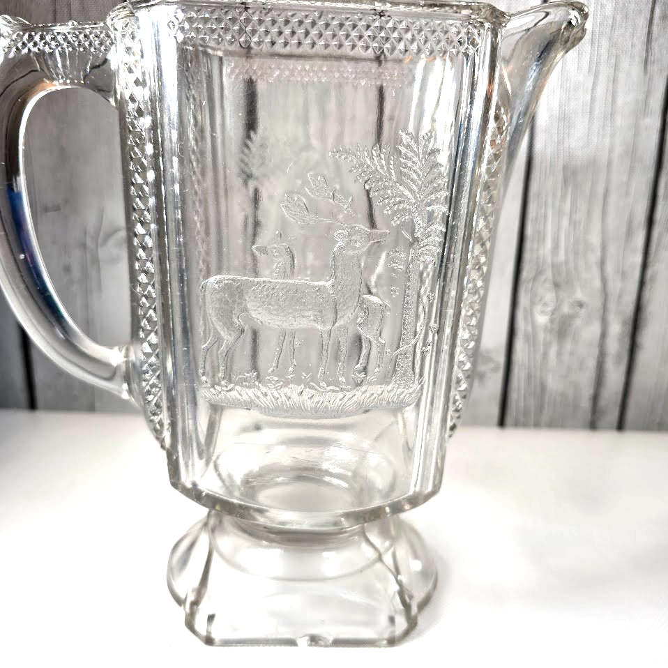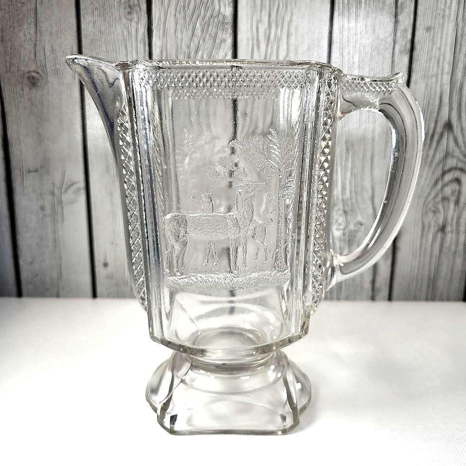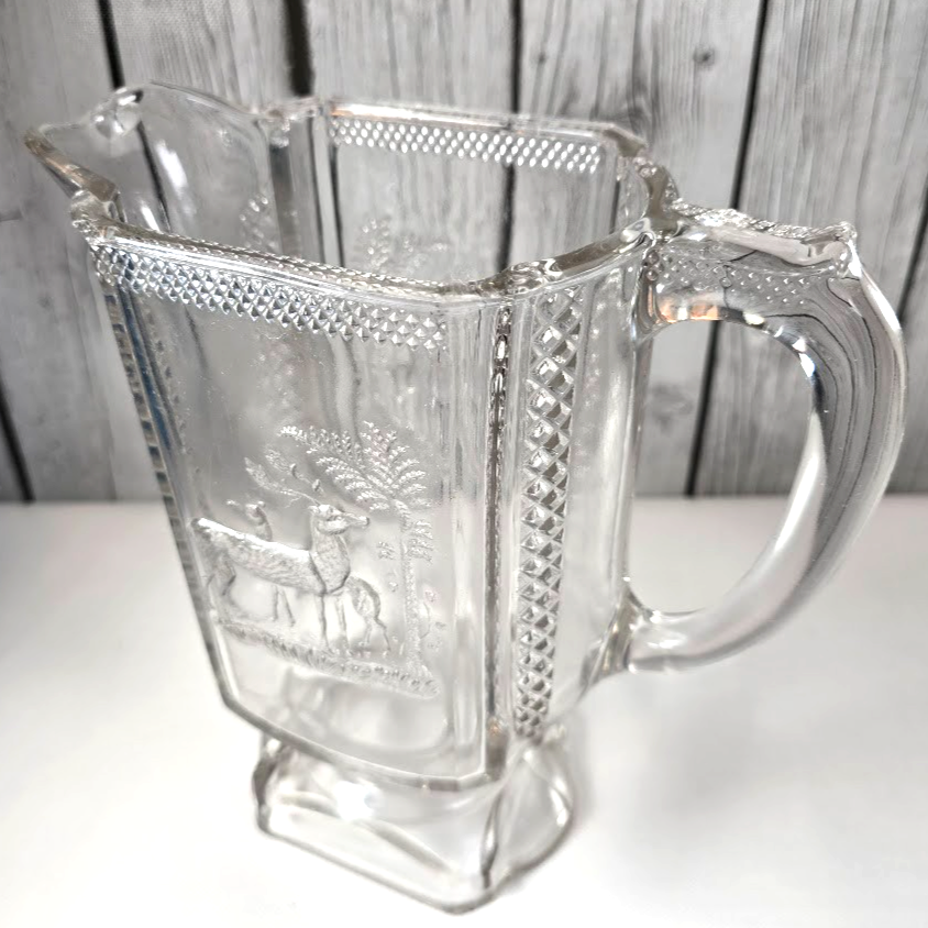 Rare 1886 Early American Pattern Glass pitcher from McKee Brothers showcases the sought after Deer and Pine Tree scene. Gleaming clear pressed glass brings woodland Victorian charm to bar cart table or collection.? Early American Pattern Glass pitcher with raised deer and pine design? Measures about 7.5 inches tall holds roughly 32 oz for water lemonade floral stems? Made in USA late Victorian 1886 perfect for rustic cabin lodge farmhouse decor? Excellent antique condition with minimal surface wear no cracks found