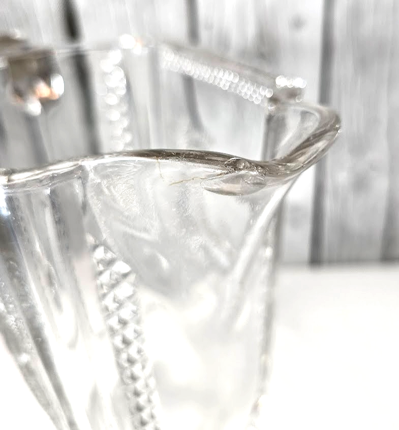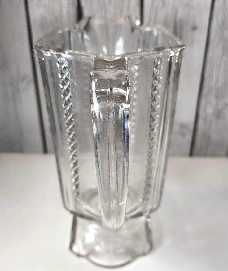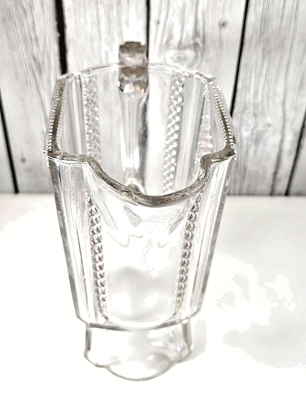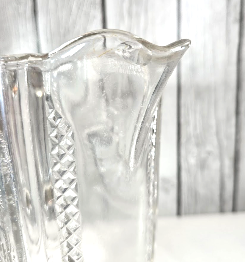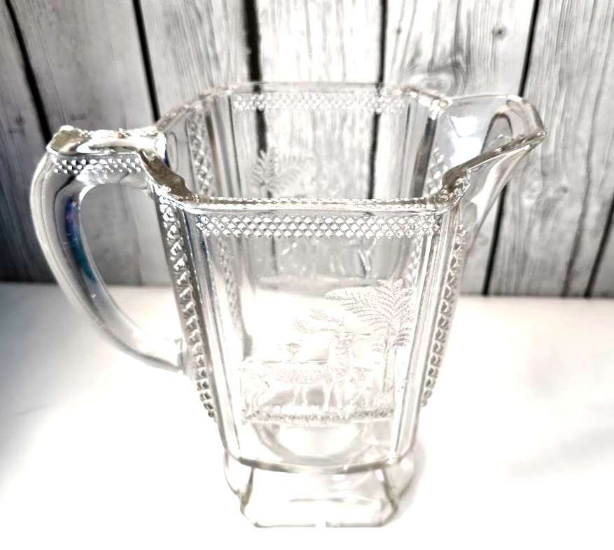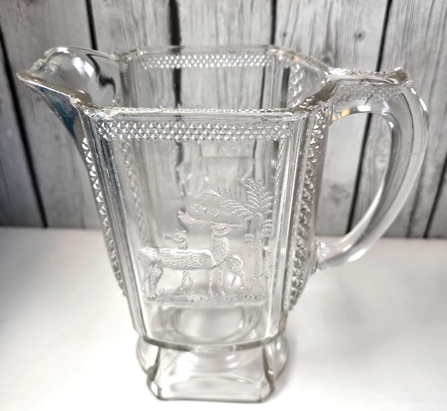 Rare 1886 Early American Pattern Glass pitcher from McKee Brothers showcases the sought after Deer and Pine Tree scene. Gleaming clear pressed glass brings woodland Victorian charm to bar cart table or collection.? Early American Pattern Glass pitcher with raised deer and pine design? Measures about 7.5 inches tall holds roughly 32 oz for water lemonade floral stems? Made in USA late Victorian 1886 perfect for rustic cabin lodge farmhouse decor? Excellent antique condition with minimal surface wear no cracks found
