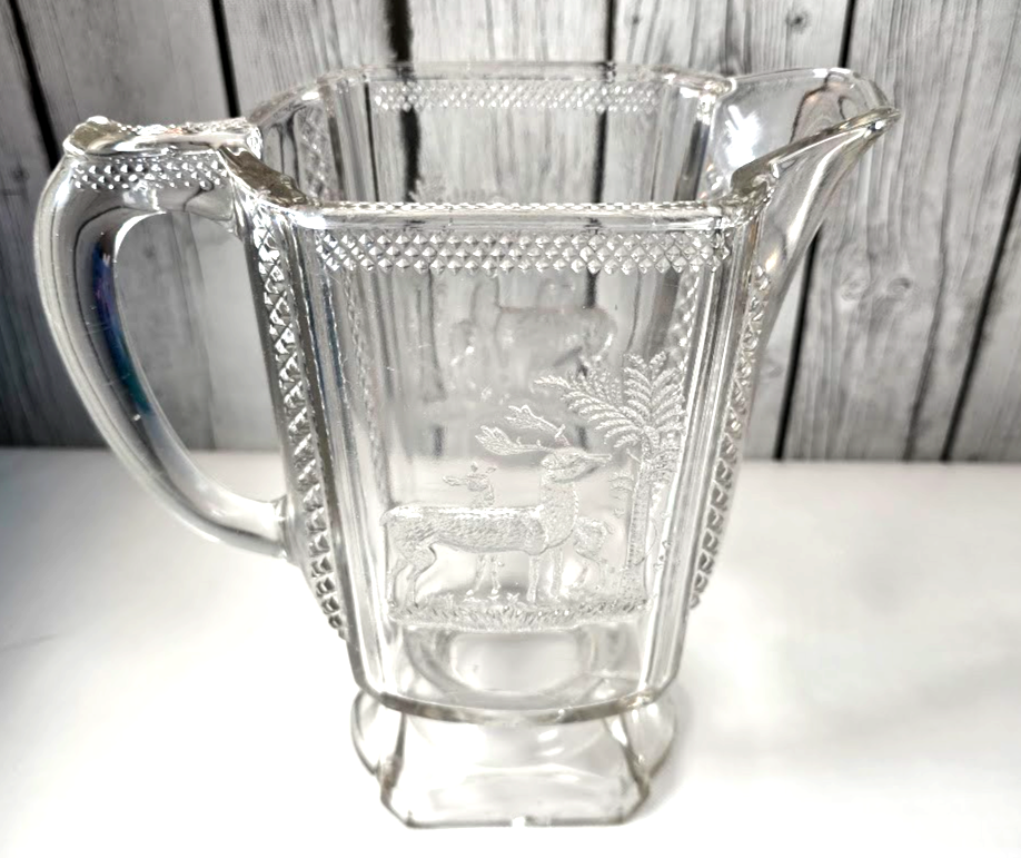 - McKee Brothers Deer and Pine Tree EAPG Pitcher Clear Glass 7.5” 1886 Antique