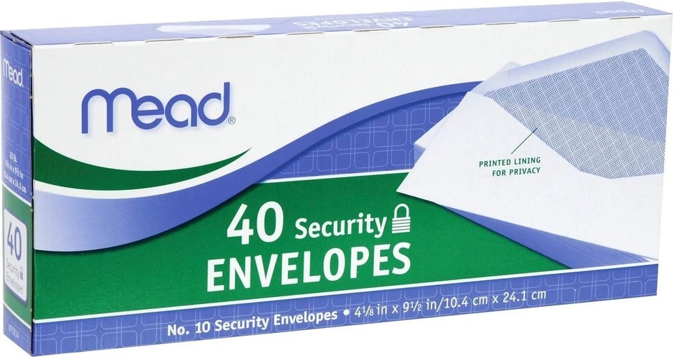 - Mead #10 Envelopes, Security Printed Lining 4-1/8" x 9-1/2", White, 40 Letter