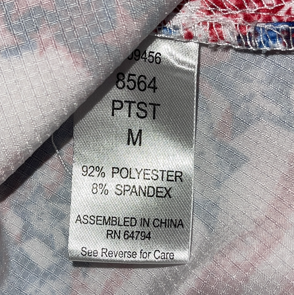 Excellent condition. Size tag medium, but runs closer to a small. Measures 21 inches across the chest and 26 inches overall length. Poly spandex mix material. Please see all photos. We are a smoke free, pet friendly home. Have a great safe day!