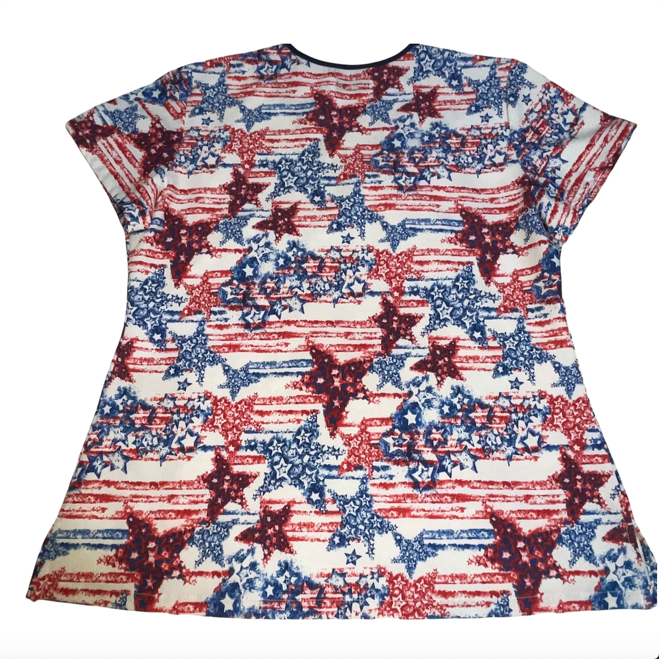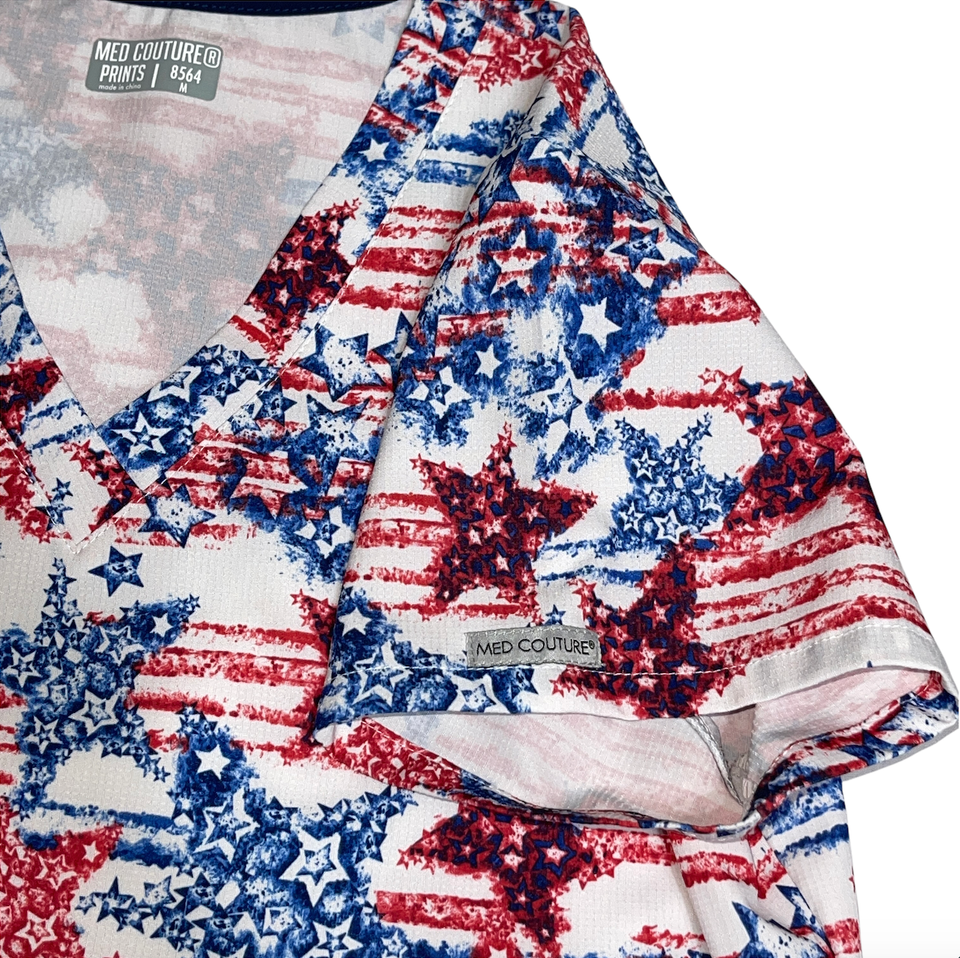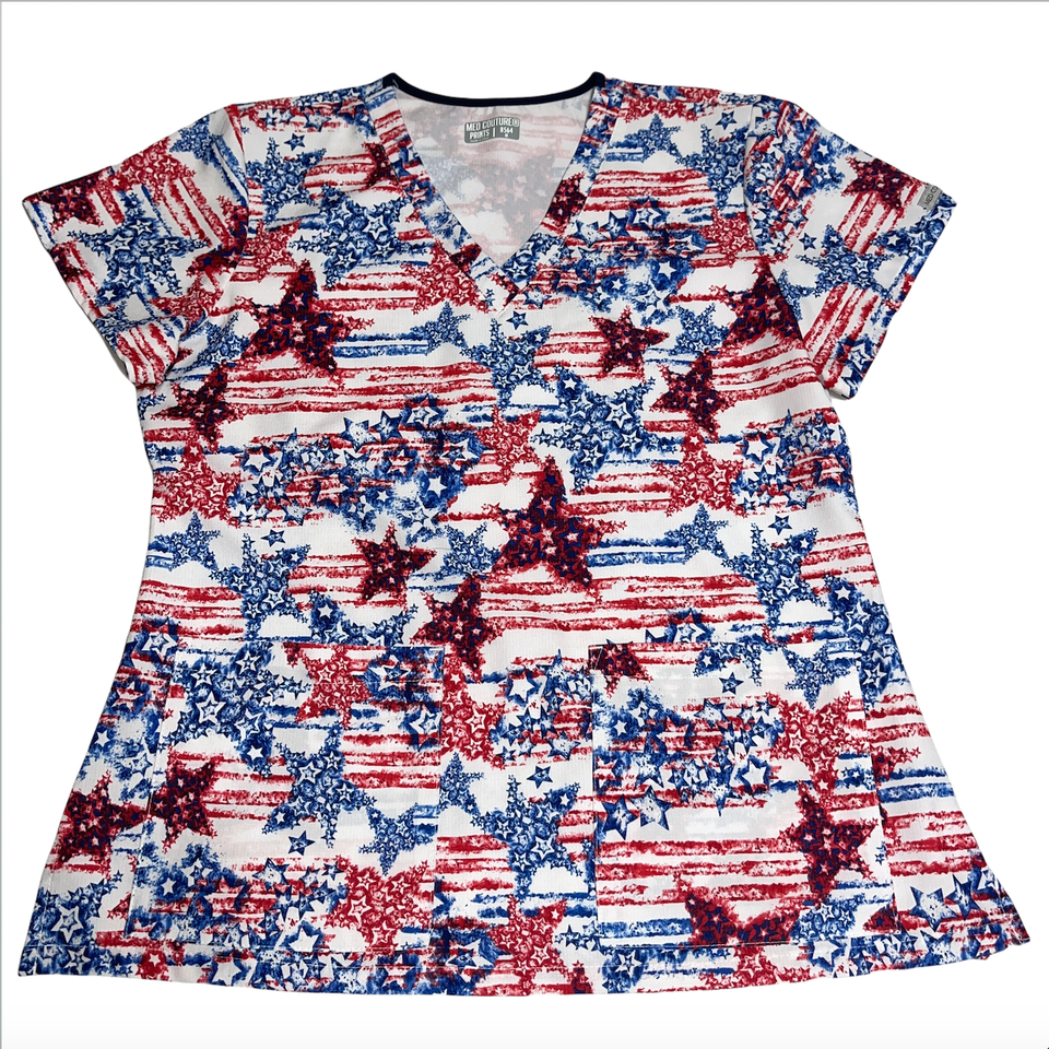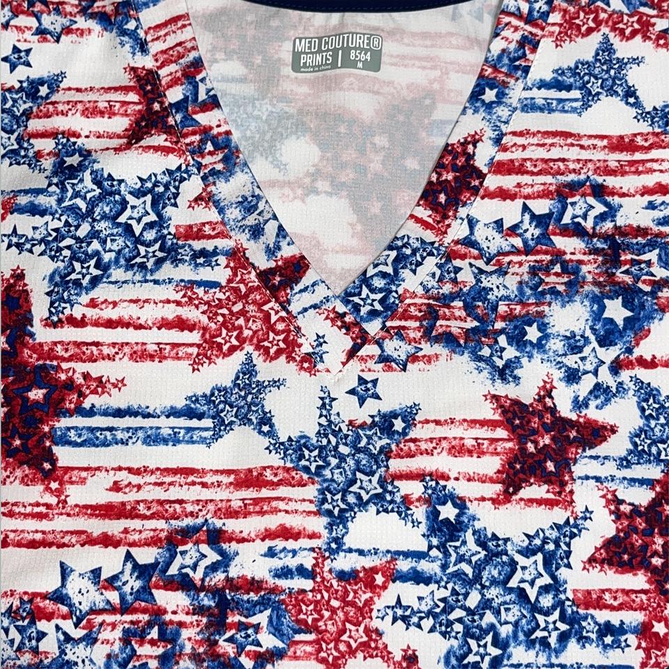 - Med Couture Patriotic Stars Stripes Red White Blue Scrub Shirt Size Small READ