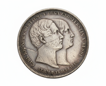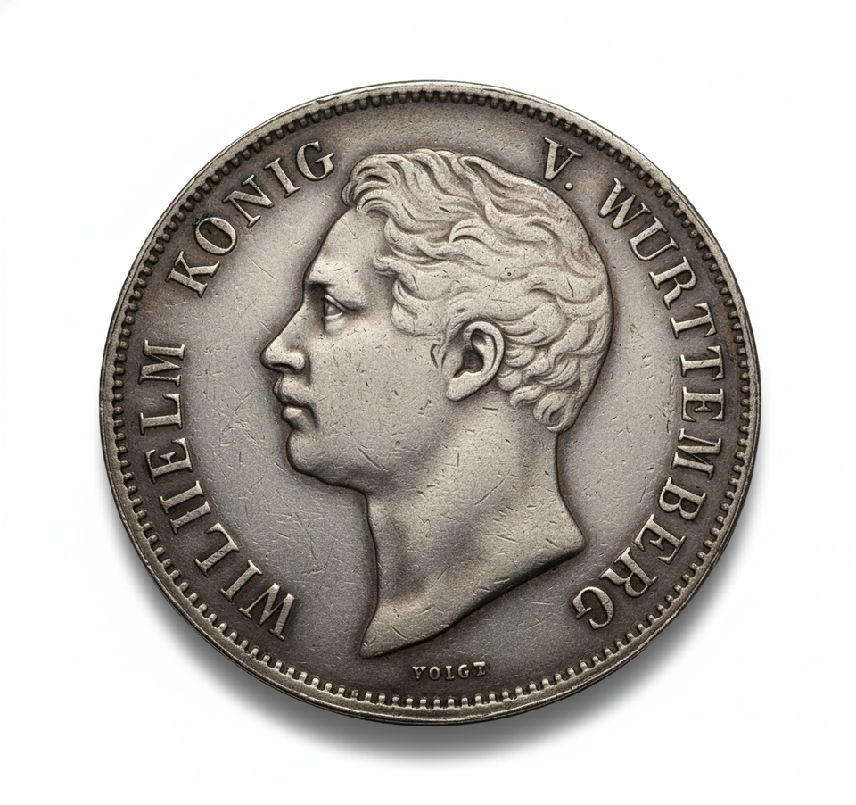 Esplora un accattivante pezzo di storia monarchica europea con questa squisita restrizione della medaglia commemorativa del Württemberg del 1846. Questa medaglia d'arte fantasy celebra la significativa unione del principe ereditario Carlo di Württemberg e della granduchessa Olga Nikolaevna. Il dritto presenta un profilo distinto del re Guglielmo I di Württemberg, sotto il cui regno avvenne questo importante matrimonio. Il rovescio raffigura splendidamente i busti congiunti del principe ereditario Carlo e Olga, che segnano il loro matrimonio il 13 luglio 1846. Questa restrizione accuratamente realizzata offre uno sguardo unico sulle celebrazioni reali del XIX secolo. E un eccezionale oggetto da collezione numismatico, perfetto per gli appassionati di manufatti storici e cimeli reali. Un vero oggetto da collezione, questo gettone simile a una prova incarna l'arte storica, rendendolo una preziosa aggiunta a qualsiasi collezione. Una superba opera d'arte per coloro che cercano profondita storica e fascino estetico.