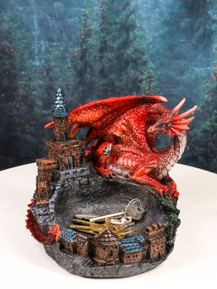 - Medieval Red Dragon On Castle Tower Decorative Ashtray Or Key Coin Dish Figurine