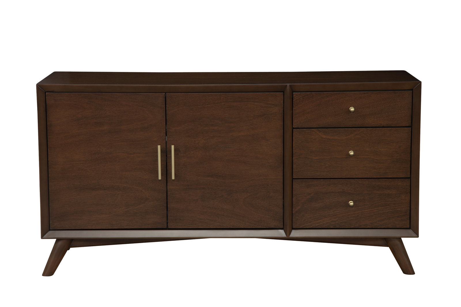 The Melbourne sideboard pairs ample storage with a streamlined, Mid-Century-inspired look. Versatile and attractive, this piece will add function and style to any room in your home. Hand-crafted from a blend of Mahogany wood solids and veneer, there are 3 drawers to store your dining linens, silverware, and other entertaining necessities. Open the 2 doors and reveal more storage for dishes and stemware, with an adjustable shelf and discrete cord management. Available in a rich walnut finish. Mix and match with other pieces from the Melbourne collection.
