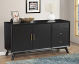 The Melbourne sideboard pairs ample storage with a streamlined, Mid-Century-inspired look. Versatile and attractive, this piece will add function and style to any room in your home. Hand-crafted from a blend of Mahogany wood solids and Okume veneer, there are 3 drawers to store your dining linens, silverware, and other entertaining necessities. Open the 2 doors and reveal more storage for dishes and stemware, with an adjustable shelf and discrete cord management. Available in a stylish black finish. Mix and match with other pieces from the Melbourne collection.