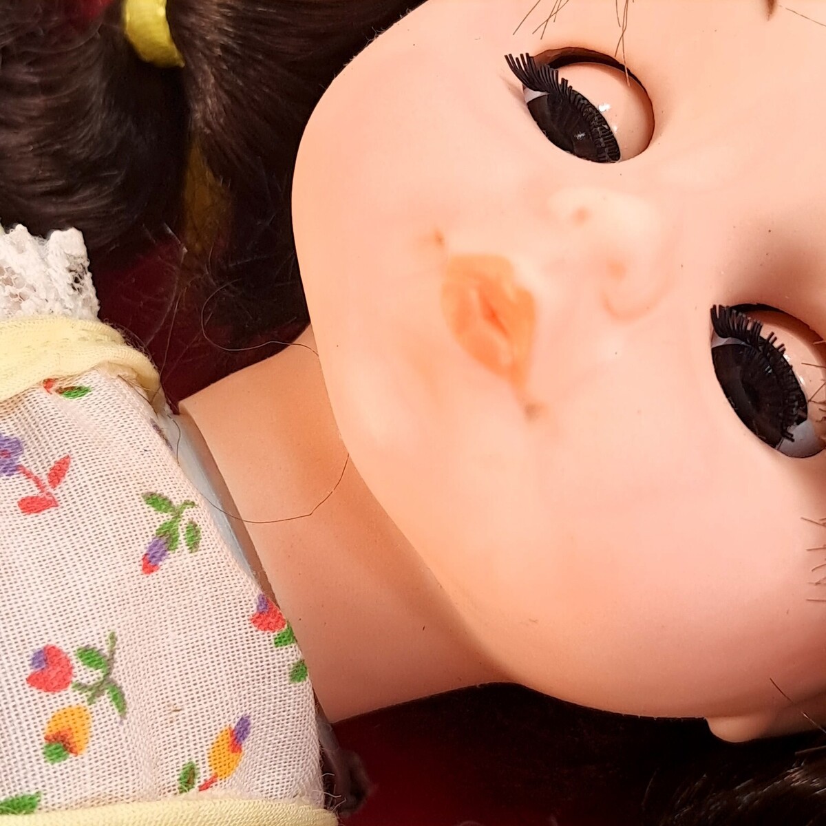 - Melissa doll box yellow dress brown hair 70's Kmart sleep eyes Hong Kong Vintage