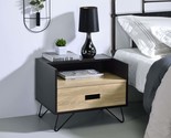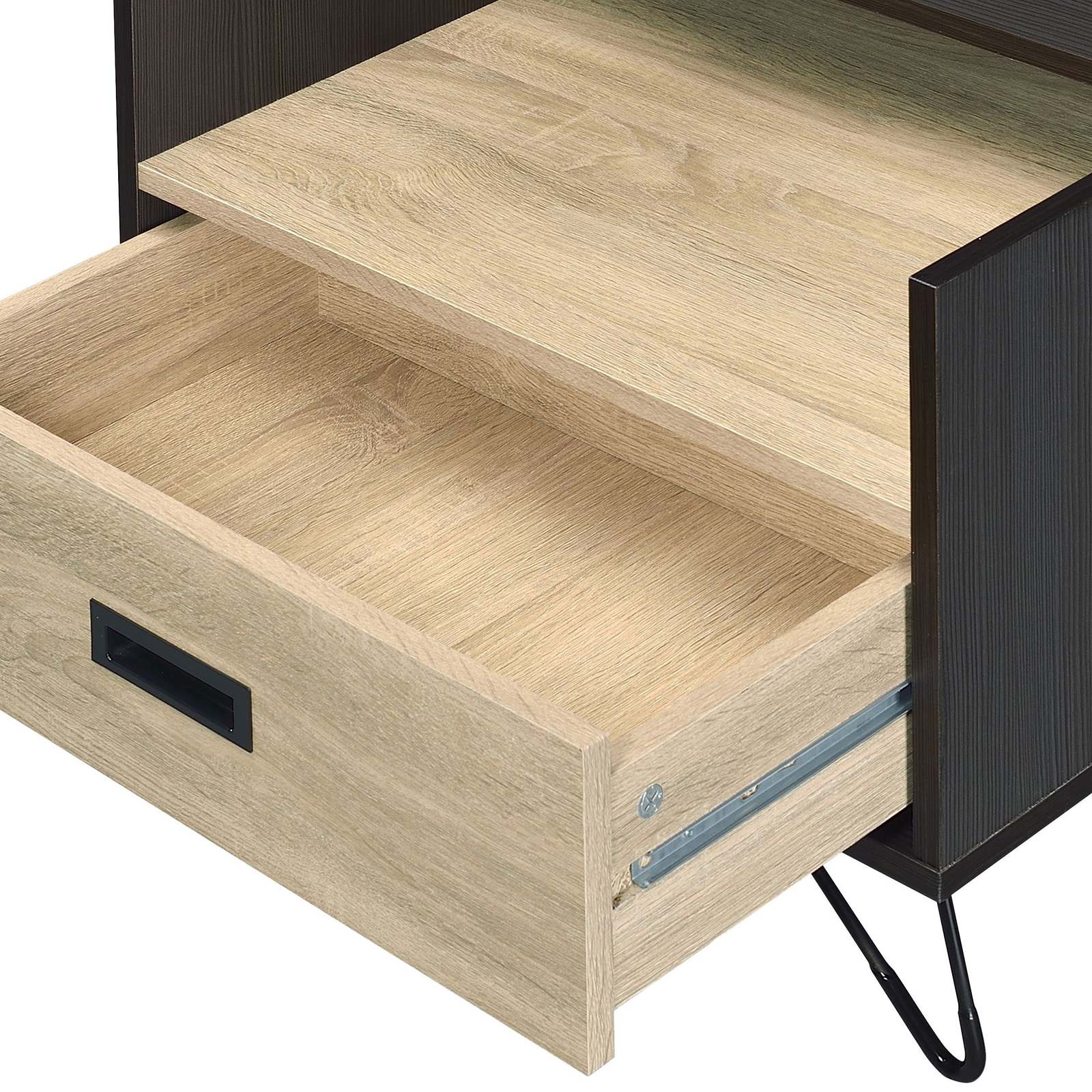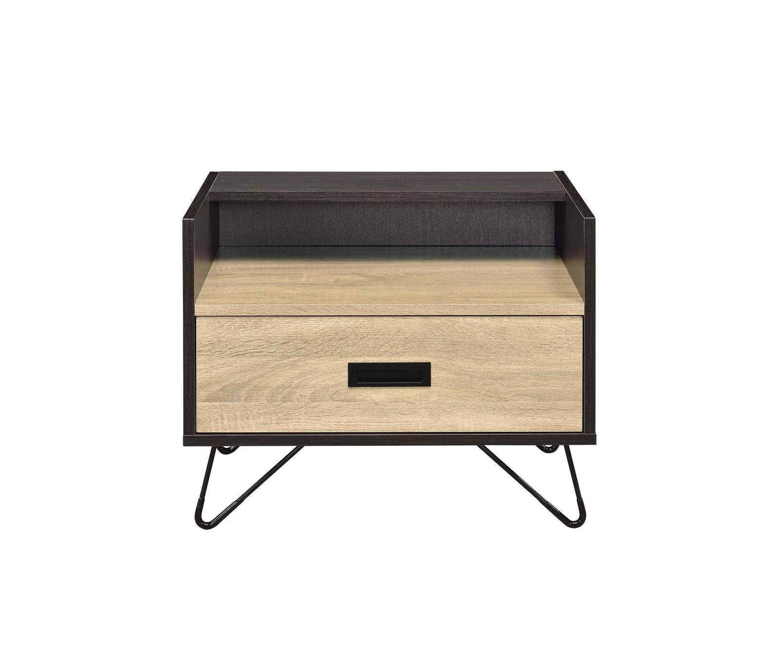 This accent table blends contemporary and industrial design elements, featuring a functional 1-drawer layout.
