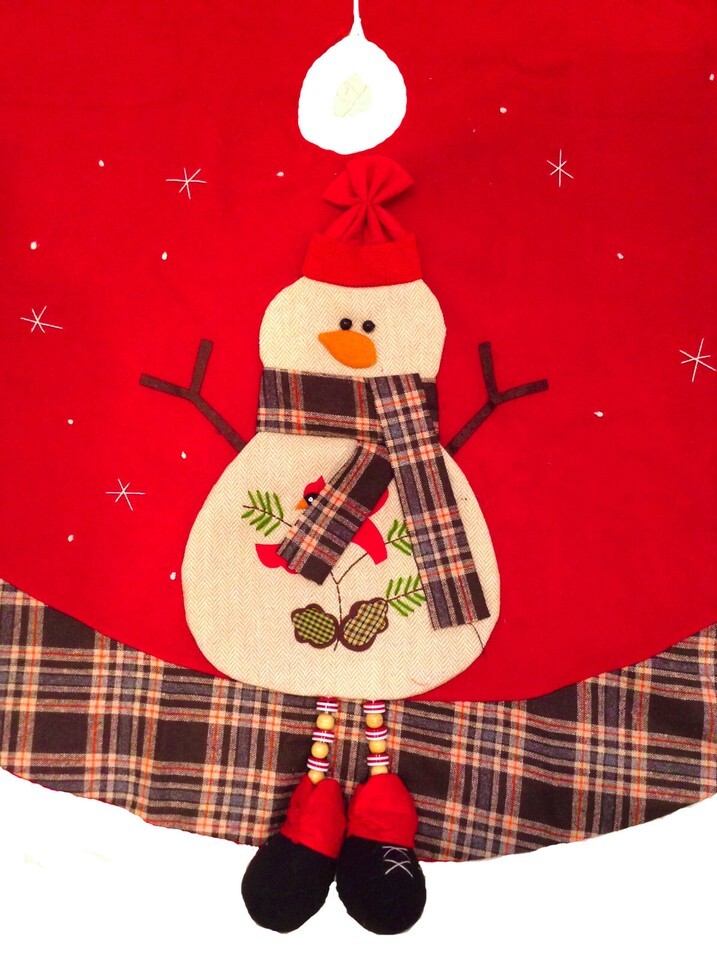 Cute 3 dimension felt Christmas tree skirt has a fun snowman applique. The snowman has a red top hat, a plaid scarf in brown, cream, red. His legs are attached with alternating red white plastic discs and wood beads. His feet have red felt top black boots. The snowman's body has 2 black beads for eyes, and an orange carrot nose. A red cardinal sits on top of a tan brown birdhouse that is nestled in a tree branch.