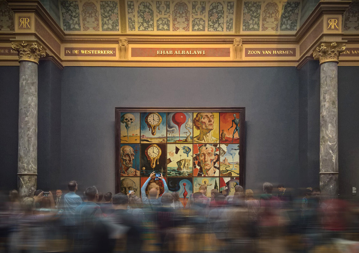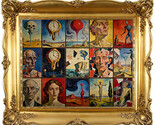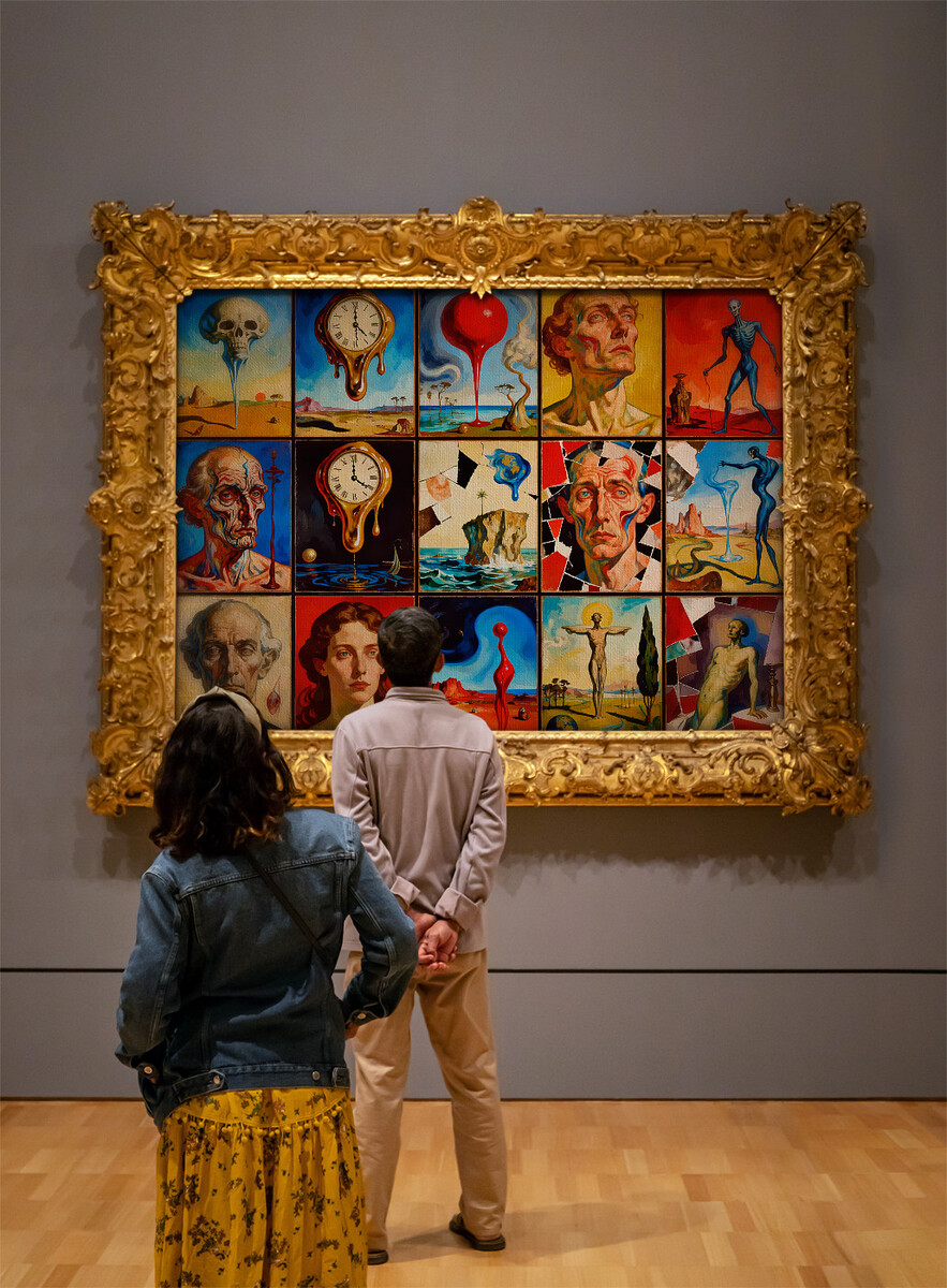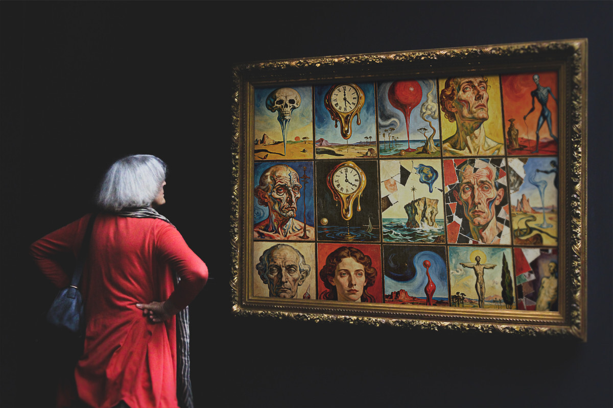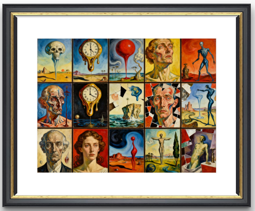 The piece features an array of surreal scenes, merging iconic symbols like melting clocks, floating skulls, faceless portraits, and color explosions. Each section is a reflection of dreams or philosophical ideas, prompting questions about time, identity, and mortality, through the juxtaposition of modernity and nature, and deeply philosophical metaphor.